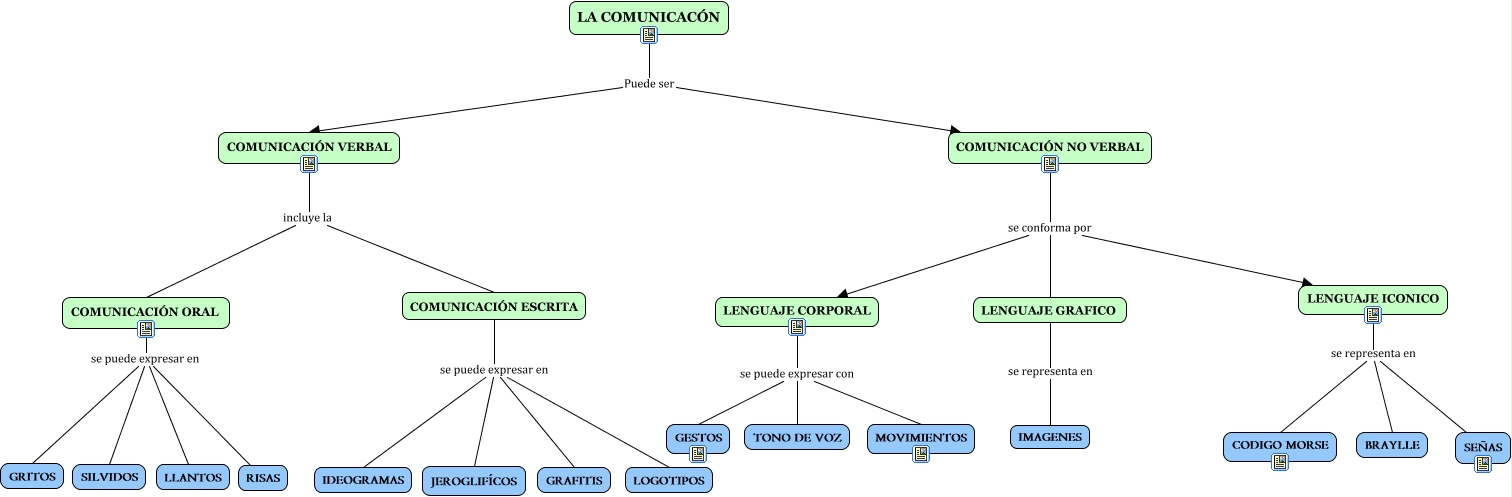 Este Cmap, tiene información relacionada con: LA COMUNICACION, COMUNICACIÓN ORAL se puede expresar en GRITOS, COMUNICACIÓN VERBAL incluye la COMUNICACIÓN ESCRITA, COMUNICACIÓN NO VERBAL se conforma por LENGUAJE CORPORAL, COMUNICACIÓN VERBAL incluye la COMUNICACIÓN ORAL, COMUNICACIÓN ESCRITA se puede expresar en JEROGLIFÍCOS, COMUNICACIÓN NO VERBAL se conforma por LENGUAJE ICONICO, LENGUAJE CORPORAL se puede expresar con MOVIMIENTOS, LA COMUNICACÓN Puede ser COMUNICACIÓN VERBAL, COMUNICACIÓN ESCRITA se puede expresar en IDEOGRAMAS, COMUNICACIÓN ORAL se puede expresar en RISAS, LENGUAJE ICONICO se representa en CODIGO MORSE, COMUNICACIÓN ESCRITA se puede expresar en GRAFITIS, LA COMUNICACÓN Puede ser COMUNICACIÓN NO VERBAL, COMUNICACIÓN ORAL se puede expresar en SILVIDOS, LENGUAJE ICONICO se representa en SEÑAS, COMUNICACIÓN ORAL se puede expresar en LLANTOS, LENGUAJE CORPORAL se puede expresar con TONO DE VOZ, LENGUAJE CORPORAL se puede expresar con GESTOS, COMUNICACIÓN ESCRITA se puede expresar en LOGOTIPOS, COMUNICACIÓN NO VERBAL se conforma por LENGUAJE GRAFICO
