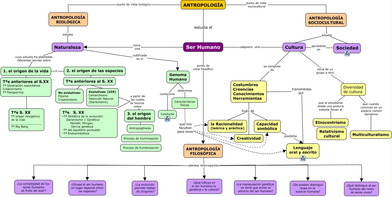 Este Cmap, tiene información relacionada con: F_2_Antropología, ANTROPOLOGÍA SOCIOCULTURAL estudia Sociedad, Genoma Humano condiciona Conducta, Diversidad de cultura que cuando conviven en un espacio común llamamos Multiculturalismo, ANTROPOLOGÍA punto de vista biológico ANTROPOLOGÍA BIOLÓGICA, Características físicas que nos facultan para tener Creatividad, ANTROPOLOGÍA FILOSÓFICA plantea interrogantes ¿Qué distingue al ser humano del resto de seres vivos?, 1. el origen de la vida ???? Tªs S. XX Tª origen inorgánico de la vida _________________ Tª Big Bang, ANTROPOLOGÍA estudia el Ser Humano, Costumbres Creencias Conocimientos Herramientas fruto de Creatividad, Características físicas determina Genoma Humano, 1. el origen de la vida y 2. el origen de las especies, ANTROPOLOGÍA FILOSÓFICA plantea interrogantes ¿Ocupa el ser humano un lugar especial entre las especies?, Cultura se compone de Costumbres Creencias Conocimientos Herramientas, ANTROPOLOGÍA BIOLÓGICA estudia Naturaleza, ANTROPOLOGÍA BIOLÓGICA estudia Naturaleza, Naturaleza codificada en el Genoma Humano, Tªs S. XX -Tª Sintética de la evolución: Darwinismo + Genética Mendel, Morgan, Deriva genética -Tª del equilibrio puntuado -Tª Endosimbiótica a partir de las cuales se teoriza sobre 3. el origen del hombre, Costumbres Creencias Conocimientos Herramientas fruto de Capacidad simbólica, Naturaleza cuyo estudio ha planteado diferentes teorías sobre 1. el origen de la vida, Evolutivas: (XIX) Lamarckismo Selección Natural (Darwinismo) a partir de las cuales se teoriza sobre 3. el origen del hombre