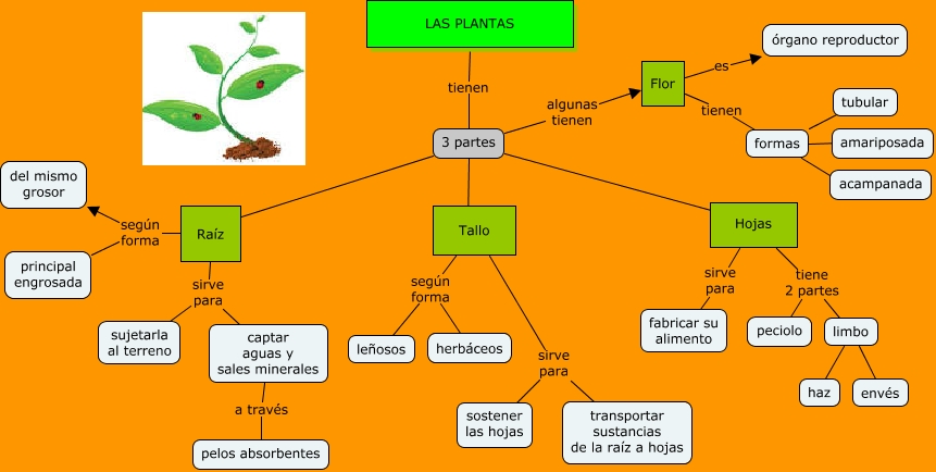 Este Cmap, tiene información relacionada con: Las Plantas, Tallo sirve para transportar sustancias de la raíz a hojas, 3 partes ???? Hojas, Hojas sirve para fabricar su alimento, formas ???? acampanada, Raíz según forma del mismo grosor, Hojas tiene 2 partes limbo, Flor es órgano reproductor, Tallo según forma herbáceos, Raíz sirve para sujetarla al terreno, Hojas tiene 2 partes peciolo, 3 partes algunas tienen Flor, Raíz según forma principal engrosada, formas ???? amariposada, Tallo sirve para sostener las hojas, formas ???? tubular, LAS PLANTAS tienen 3 partes, limbo ???? haz, Tallo según forma leñosos, 3 partes ???? Raíz, limbo ???? envés