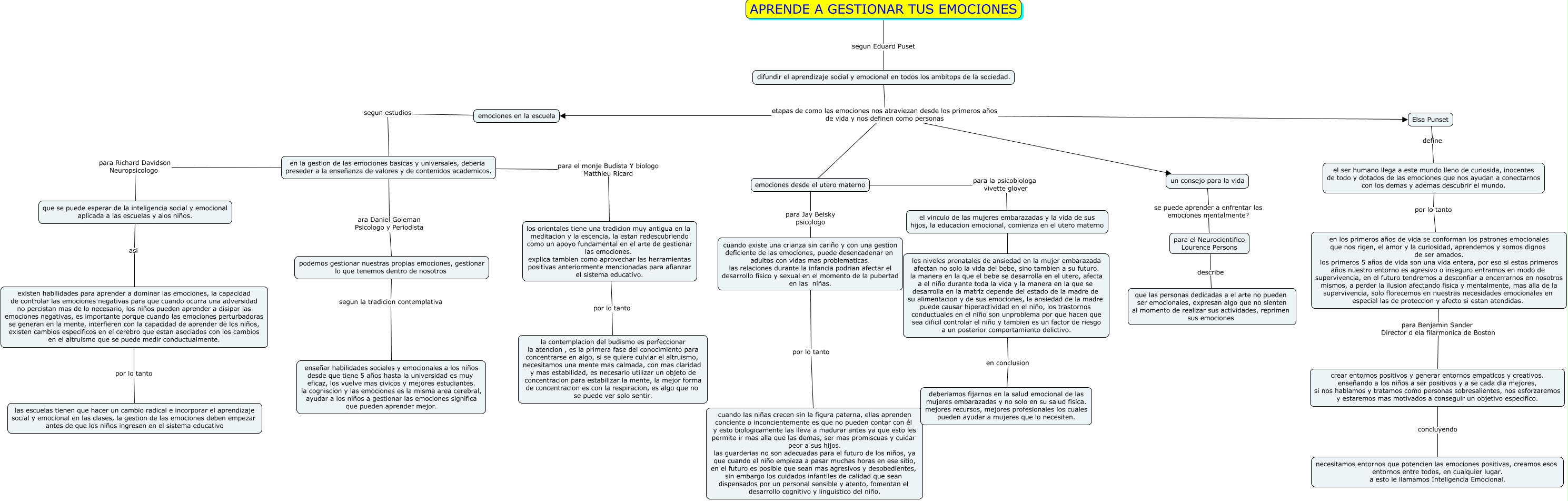 Este Cmap, tiene información relacionada con: aprender a gestionar las emociones, el vinculo de las mujeres embarazadas y la vida de sus hijos, la educacion emocional, comienza en el utero materno por lo tanto los niveles prenatales de ansiedad en la mujer embarazada afectan no solo la vida del bebe, sino tambien a su futuro. la manera en la que el bebe se desarrolla en el utero, afecta a el niño durante toda la vida y la manera en la que se desarrolla en la matriz depende del estado de la madre de su alimentacion y de sus emociones, la ansiedad de la madre puede causar hiperactividad en el niño, los trastornos conductuales en el niño son unproblema por que hacen que sea dificil controlar el niño y tambien es un factor de riesgo a un posterior comportamiento delictivo., que se puede esperar de la inteligencia social y emocional aplicada a las escuelas y alos niños. asi existen habilidades para aprender a dominar las emociones, la capacidad de controlar las emociones negativas para que cuando ocurra una adversidad no percistan mas de lo necesario, los niños pueden aprender a disipar las emociones negativas, es importante porque cuando las emociones perturbadoras se generan en la mente, interfieren con la capacidad de aprender de los niños, existen cambios especificos en el cerebro que estan asociados con los cambios en el altruismo que se puede medir conductualmente., emociones desde el utero materno para Jay Belsky psicologo cuando existe una crianza sin cariño y con una gestion deficiente de las emociones, puede desencadenar en adultos con vidas mas problematicas. las relaciones durante la infancia podrian afectar el desarrollo fisico y sexual en el momento de la pubertad en las niñas., difundir el aprendizaje social y emocional en todos los ambitops de la sociedad. etapas de como las emociones nos atraviezan desde los primeros años de vida y nos definen como personas emociones desde el utero materno, difundir el aprendizaje social y emocional en todos los ambitops de la sociedad. etapas de como las emociones nos atraviezan desde los primeros años de vida y nos definen como personas Elsa Punset, en la gestion de las emociones basicas y universales, deberia preseder a la enseñanza de valores y de contenidos academicos. para el monje Budista Y biologo Matthieu Ricard los orientales tiene una tradicion muy antigua en la meditacion y la escencia, la estan redescubriendo como un apoyo fundamental en el arte de gestionar las emociones. explica tambien como aprovechar las herramientas positivas anteriormente mencionadas para afianzar el sistema educativo., Elsa Punset define el ser humano llega a este mundo lleno de curiosida, inocentes de todo y dotados de las emociones que nos ayudan a conectarnos con los demas y ademas descubrir el mundo., en la gestion de las emociones basicas y universales, deberia preseder a la enseñanza de valores y de contenidos academicos. para Richard Davidson Neuropsicologo que se puede esperar de la inteligencia social y emocional aplicada a las escuelas y alos niños., existen habilidades para aprender a dominar las emociones, la capacidad de controlar las emociones negativas para que cuando ocurra una adversidad no percistan mas de lo necesario, los niños pueden aprender a disipar las emociones negativas, es importante porque cuando las emociones perturbadoras se generan en la mente, interfieren con la capacidad de aprender de los niños, existen cambios especificos en el cerebro que estan asociados con los cambios en el altruismo que se puede medir conductualmente. por lo tanto las escuelas tienen que hacer un cambio radical e incorporar el aprendizaje social y emocional en las clases, la gestion de las emociones deben empezar antes de que los niños ingresen en el sistema educativo, difundir el aprendizaje social y emocional en todos los ambitops de la sociedad. etapas de como las emociones nos atraviezan desde los primeros años de vida y nos definen como personas emociones en la escuela, emociones en la escuela segun estudios en la gestion de las emociones basicas y universales, deberia preseder a la enseñanza de valores y de contenidos academicos., difundir el aprendizaje social y emocional en todos los ambitops de la sociedad. etapas de como las emociones nos atraviezan desde los primeros años de vida y nos definen como personas un consejo para la vida, un consejo para la vida se puede aprender a enfrentar las emociones mentalmente? para el Neurocientifico Lourence Persons, en la gestion de las emociones basicas y universales, deberia preseder a la enseñanza de valores y de contenidos academicos. ara Daniel Goleman Psicologo y Periodista podemos gestionar nuestras propias emociones, gestionar lo que tenemos dentro de nosotros, emociones desde el utero materno para la psicobiologa vivette glover el vinculo de las mujeres embarazadas y la vida de sus hijos, la educacion emocional, comienza en el utero materno, cuando existe una crianza sin cariño y con una gestion deficiente de las emociones, puede desencadenar en adultos con vidas mas problematicas. las relaciones durante la infancia podrian afectar el desarrollo fisico y sexual en el momento de la pubertad en las niñas. por lo tanto cuando las niñas crecen sin la figura paterna, ellas aprenden conciente o inconcientemente es que no pueden contar con él y esto biologicamente las lleva a madurar antes ya que esto les permite ir mas alla que las demas, ser mas promiscuas y cuidar peor a sus hijos. las guarderias no son adecuadas para el futuro de los niños, ya que cuando el niño empieza a pasar muchas horas en ese sitio, en el futuro es posible que sean mas agresivos y desobedientes, sin embargo los cuidados infantiles de calidad que sean dispensados por un personal sensible y atento, fomentan el desarrollo cognitivo y linguistico del niño., podemos gestionar nuestras propias emociones, gestionar lo que tenemos dentro de nosotros segun la tradicion contemplativa enseñar habilidades so