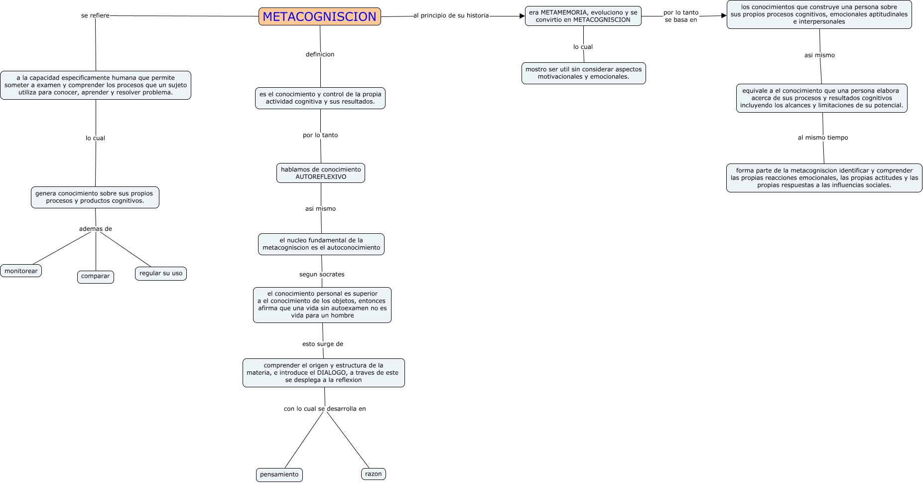 Este Cmap, tiene información relacionada con: metacogniscion, el nucleo fundamental de la metacogniscion es el autoconocimiento segun socrates el conocimiento personal es superior a el conocimiento de los objetos, entonces afirma que una vida sin autoexamen no es vida para un hombre, METACOGNISCION se refiere a la capacidad especificamente humana que permite someter a examen y comprender los procesos que un sujeto utiliza para conocer, aprender y resolver problema., genera conocimiento sobre sus propios procesos y productos cognitivos. ademas de comparar, comprender el origen y estructura de la materia, e introduce el DIALOGO, a traves de este se desplega a la reflexion con lo cual se desarrolla en pensamiento, equivale a el conocimiento que una persona elabora acerca de sus procesos y resultados cognitivos incluyendo los alcances y limitaciones de su potencial. al mismo tiempo forma parte de la metacogniscion identificar y comprender las propias reacciones emocionales, las propias actitudes y las propias respuestas a las influencias sociales., genera conocimiento sobre sus propios procesos y productos cognitivos. ademas de regular su uso, es el conocimiento y control de la propia actividad cognitiva y sus resultados. por lo tanto hablamos de conocimiento AUTOREFLEXIVO, era METAMEMORIA, evoluciono y se convirtio en METACOGNISCION lo cual mostro ser util sin considerar aspectos motivacionales y emocionales., era METAMEMORIA, evoluciono y se convirtio en METACOGNISCION por lo tanto se basa en los conocimientos que construye una persona sobre sus propios procesos cognitivos, emocionales aptitudinales e interpersonales, METACOGNISCION al principio de su historia era METAMEMORIA, evoluciono y se convirtio en METACOGNISCION, el conocimiento personal es superior a el conocimiento de los objetos, entonces afirma que una vida sin autoexamen no es vida para un hombre esto surge de comprender el origen y estructura de la materia, e introduce el DIALOGO, a traves de este se desplega a la reflexion, genera conocimiento sobre sus propios procesos y productos cognitivos. ademas de monitorear, los conocimientos que construye una persona sobre sus propios procesos cognitivos, emocionales aptitudinales e interpersonales asi mismo equivale a el conocimiento que una persona elabora acerca de sus procesos y resultados cognitivos incluyendo los alcances y limitaciones de su potencial., hablamos de conocimiento AUTOREFLEXIVO asi mismo el nucleo fundamental de la metacogniscion es el autoconocimiento, METACOGNISCION definicion es el conocimiento y control de la propia actividad cognitiva y sus resultados., a la capacidad especificamente humana que permite someter a examen y comprender los procesos que un sujeto utiliza para conocer, aprender y resolver problema. lo cual genera conocimiento sobre sus propios procesos y productos cognitivos., comprender el origen y estructura de la materia, e introduce el DIALOGO, a traves de este se desplega a la reflexion con lo cual se desarrolla en razon