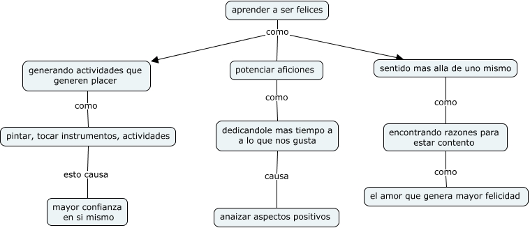 Este Cmap, tiene información relacionada con: aprender a ser felices, dedicandole mas tiempo a a lo que nos gusta causa anaizar aspectos positivos, aprender a ser felices como potenciar aficiones, aprender a ser felices como sentido mas alla de uno mismo, pintar, tocar instrumentos, actividades esto causa mayor confianza en si mismo, potenciar aficiones como dedicandole mas tiempo a a lo que nos gusta, aprender a ser felices como generando actividades que generen placer, encontrando razones para estar contento como el amor que genera mayor felicidad, sentido mas alla de uno mismo como encontrando razones para estar contento, generando actividades que generen placer como pintar, tocar instrumentos, actividades