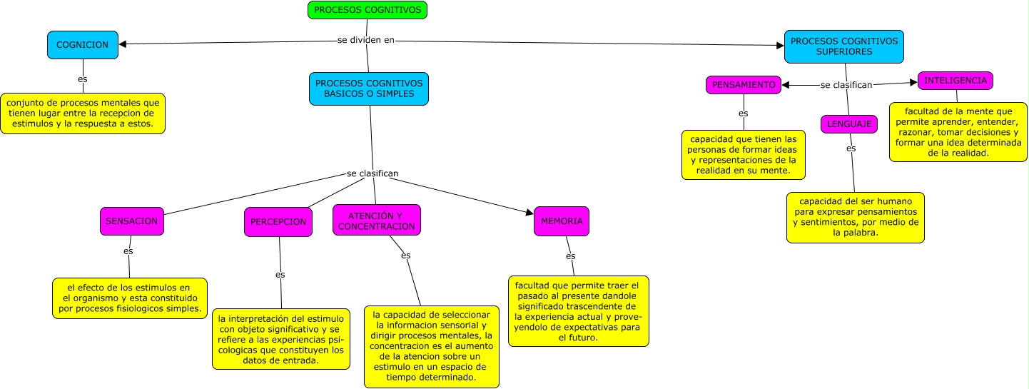 Este Cmap, tiene información relacionada con: PROCESOS COGNITIVOS 3, LENGUAJE es capacidad del ser humano para expresar pensamientos y sentimientos, por medio de la palabra., PROCESOS COGNITIVOS BASICOS O SIMPLES se clasifican PERCEPCION, PROCESOS COGNITIVOS SUPERIORES se clasifican LENGUAJE, PROCESOS COGNITIVOS se dividen en COGNICION, ATENCIÓN Y CONCENTRACION es la capacidad de seleccionar la informacion sensorial y dirigir procesos mentales, la concentracion es el aumento de la atencion sobre un estimulo en un espacio de tiempo determinado., SENSACION se clasifican MEMORIA, PROCESOS COGNITIVOS BASICOS O SIMPLES se clasifican ATENCIÓN Y CONCENTRACION, SENSACION se clasifican PERCEPCION, PERCEPCION es la interpretación del estimulo con objeto significativo y se refiere a las experiencias psi- cologicas que constituyen los datos de entrada., PROCESOS COGNITIVOS SUPERIORES se clasifican PENSAMIENTO, PENSAMIENTO es capacidad que tienen las personas de formar ideas y representaciones de la realidad en su mente., PROCESOS COGNITIVOS BASICOS O SIMPLES se clasifican MEMORIA, PROCESOS COGNITIVOS se dividen en PROCESOS COGNITIVOS BASICOS O SIMPLES, MEMORIA es facultad que permite traer el pasado al presente dandole significado trascendente de la experiencia actual y prove- yendolo de expectativas para el futuro., INTELIGENCIA es facultad de la mente que permite aprender, entender, razonar, tomar decisiones y formar una idea determinada de la realidad., PROCESOS COGNITIVOS se dividen en PROCESOS COGNITIVOS SUPERIORES, COGNICION es conjunto de procesos mentales que tienen lugar entre la recepcion de estimulos y la respuesta a estos., SENSACION es el efecto de los estimulos en el organismo y esta constituido por procesos fisiologicos simples., SENSACION se clasifican ATENCIÓN Y CONCENTRACION, PROCESOS COGNITIVOS SUPERIORES se clasifican INTELIGENCIA