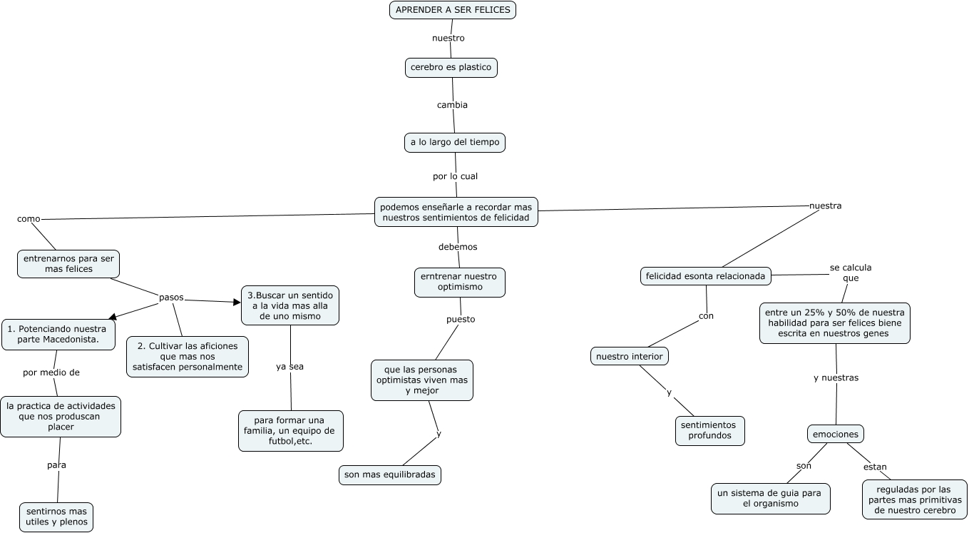 Este Cmap, tiene información relacionada con: aprender a ser felices, felicidad esonta relacionada con nuestro interior, erntrenar nuestro optimismo puesto que las personas optimistas viven mas y mejor, entrenarnos para ser mas felices pasos 3.Buscar un sentido a la vida mas alla de uno mismo, felicidad esonta relacionada se calcula que entre un 25% y 50% de nuestra habilidad para ser felices biene escrita en nuestros genes, nuestro interior y sentimientos profundos, APRENDER A SER FELICES nuestro cerebro es plastico, emociones estan reguladas por las partes mas primitivas de nuestro cerebro, podemos enseñarle a recordar mas nuestros sentimientos de felicidad debemos erntrenar nuestro optimismo, 3.Buscar un sentido a la vida mas alla de uno mismo ya sea para formar una familia, un equipo de futbol,etc., la practica de actividades que nos produscan placer para sentirnos mas utiles y plenos, cerebro es plastico cambia a lo largo del tiempo, entre un 25% y 50% de nuestra habilidad para ser felices biene escrita en nuestros genes y nuestras emociones, entrenarnos para ser mas felices pasos 2. Cultivar las aficiones que mas nos satisfacen personalmente, a lo largo del tiempo por lo cual podemos enseñarle a recordar mas nuestros sentimientos de felicidad, que las personas optimistas viven mas y mejor y son mas equilibradas, podemos enseñarle a recordar mas nuestros sentimientos de felicidad como entrenarnos para ser mas felices, emociones son un sistema de guia para el organismo, podemos enseñarle a recordar mas nuestros sentimientos de felicidad nuestra felicidad esonta relacionada, 1. Potenciando nuestra parte Macedonista. por medio de la practica de actividades que nos produscan placer, entrenarnos para ser mas felices pasos 1. Potenciando nuestra parte Macedonista.