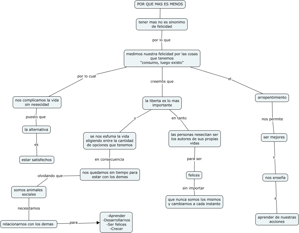 Este Cmap, tiene información relacionada con: por que mas es menos, las personas nesecitan ser los autores de sus propias vidas para ser felices, la alternativa es estar satisfechos, medimos nuestra felicidad por las cosas que tenemos "consumo, luego existo" creemos que la liberta es lo mas importante, felices sin importar que nunca somos los mismos y cambiamos a cada instante, tener mas no es sinonimo de felicidad por lo que medimos nuestra felicidad por las cosas que tenemos "consumo, luego existo", POR QUE MAS ES MENOS ???? tener mas no es sinonimo de felicidad, ser mejores y nos enseña, la liberta es lo mas importante y se nos esfuma la vida eligiendo entre la cantidad de opciones que tenemos, nos quedamos sin tiempo para estar con los demas olvidando que somos animales sociales, medimos nuestra felicidad por las cosas que tenemos "consumo, luego existo" el arrepentimiento, la liberta es lo mas importante en tanto las personas nesecitan ser los autores de sus propias vidas, medimos nuestra felicidad por las cosas que tenemos "consumo, luego existo" por lo cual nos complicamos la vida sin nesecidad, somos animales sociales necesitamos relacionarnos con los demas, arrepentimiento nos permite ser mejores, se nos esfuma la vida eligiendo entre la cantidad de opciones que tenemos en consecuencia nos quedamos sin tiempo para estar con los demas, nos enseña a aprender de nuestras acciones, relacionarnos con los demas para -Aprender -Desarrollarnos -Ser felices -Crecer, nos complicamos la vida sin nesecidad puesto que la alternativa