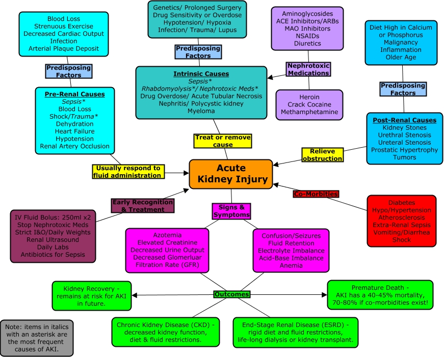 This Concept Map, created with IHMC CmapTools, has information related to: Acute Kidney Injury, Post-Renal Causes Kidney Stones Urethral Stenosis Ureteral Stenosis Prostatic Hypertrophy Tumors Relieve obstruction Acute Kidney Injury, Blood Loss Strenuous Exercise Decreased Cardiac Output Infection Arterial Plaque Deposit Predisposing Factors Pre-Renal Causes Sepsis* Blood Loss Shock/Trauma* Dehydration Heart Failure Hypotension Renal Artery Occlusion, Confusion/Seizures Fluid Retention Electrolyte Imbalance Acid-Base Imbalance Anemia Outcomes End-Stage Renal Disease (ESRD) - rigid diet and fluid restrictions, life-long dialysis or kidney transplant., Confusion/Seizures Fluid Retention Electrolyte Imbalance Acid-Base Imbalance Anemia Outcomes Kidney Recovery - remains at risk for AKI in future., Confusion/Seizures Fluid Retention Electrolyte Imbalance Acid-Base Imbalance Anemia Outcomes Premature Death - AKI has a 40-45% mortality, 70-80% if co-morbidities exist!, Acute Kidney Injury Signs & Symptoms Confusion/Seizures Fluid Retention Electrolyte Imbalance Acid-Base Imbalance Anemia, Genetics/ Prolonged Surgery Drug Sensitivity or Overdose Hypotension/ Hypoxia Infection/ Trauma/ Lupus Predisposing Factors Intrinsic Causes Sepsis* Rhabdomyolysis*/Nephrotoxic Meds* Drug Overdose/ Acute Tubular Necrosis Nephritis/ Polycystic kidney Myeloma, Intrinsic Causes Sepsis* Rhabdomyolysis*/Nephrotoxic Meds* Drug Overdose/ Acute Tubular Necrosis Nephritis/ Polycystic kidney Myeloma Treat or remove cause Acute Kidney Injury, Azotemia Elevated Creatinine Decreased Urine Output Decreased Glomerluar Filtration Rate (GFR) Outcomes Kidney Recovery - remains at risk for AKI in future., Aminoglycosides ACE Inhibitors/ARBs MAO Inhibitors NSAIDs Diuretics Nephrotoxic Medications Intrinsic Causes Sepsis* Rhabdomyolysis*/Nephrotoxic Meds* Drug Overdose/ Acute Tubular Necrosis Nephritis/ Polycystic kidney Myeloma, IV Fluid Bolus: 250ml x2 Stop Nephrotoxic Meds Strict I&O/Daily Weights Renal Ultrasound Daily Labs Antibiotics for Sepsis Early Recognition & Treatment Acute Kidney Injury, Pre-Renal Causes Sepsis* Blood Loss Shock/Trauma* Dehydration Heart Failure Hypotension Renal Artery Occlusion Usually respond to fluid administration Acute Kidney Injury, Confusion/Seizures Fluid Retention Electrolyte Imbalance Acid-Base Imbalance Anemia Outcomes Chronic Kidney Disease (CKD) - decreased kidney function, diet & fluid restrictions., Azotemia Elevated Creatinine Decreased Urine Output Decreased Glomerluar Filtration Rate (GFR) Outcomes Chronic Kidney Disease (CKD) - decreased kidney function, diet & fluid restrictions., Acute Kidney Injury Signs & Symptoms Azotemia Elevated Creatinine Decreased Urine Output Decreased Glomerluar Filtration Rate (GFR), Diabetes Hypo/Hypertension Atherosclerosis Extra-Renal Sepsis Vomiting/Diarrhea Shock Co-Morbities Acute Kidney Injury, Azotemia Elevated Creatinine Decreased Urine Output Decreased Glomerluar Filtration Rate (GFR) Outcomes Premature Death - AKI has a 40-45% mortality, 70-80% if co-morbidities exist!, Azotemia Elevated Creatinine Decreased Urine Output Decreased Glomerluar Filtration Rate (GFR) Outcomes End-Stage Renal Disease (ESRD) - rigid diet and fluid restrictions, life-long dialysis or kidney transplant., Heroin Crack Cocaine Methamphetamine Nephrotoxic Medications Intrinsic Causes Sepsis* Rhabdomyolysis*/Nephrotoxic Meds* Drug Overdose/ Acute Tubular Necrosis Nephritis/ Polycystic kidney Myeloma, Diet High in Calcium or Phosphorus Malignancy Inflammation Older Age Predisposing Factors Post-Renal Causes Kidney Stones Urethral Stenosis Ureteral Stenosis Prostatic Hypertrophy Tumors