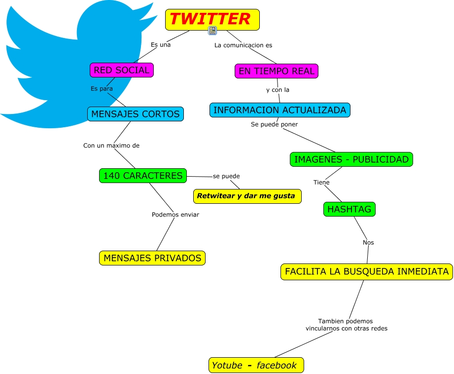 Este Cmap, tiene información relacionada con: twitter cmap, TWITTER La comunicacion es EN TIEMPO REAL, INFORMACION ACTUALIZADA Se puede poner IMAGENES - PUBLICIDAD, EN TIEMPO REAL y con la INFORMACION ACTUALIZADA, FACILITA LA BUSQUEDA INMEDIATA Tambien podemos vincularnos con otras redes Yotube - facebook, MENSAJES CORTOS Con un maximo de 140 CARACTERES, TWITTER Es una RED SOCIAL, 140 CARACTERES Podemos enviar MENSAJES PRIVADOS, IMAGENES - PUBLICIDAD Tiene HASHTAG, RED SOCIAL Es para MENSAJES CORTOS, HASHTAG Nos FACILITA LA BUSQUEDA INMEDIATA, 140 CARACTERES se puede Retwitear y dar me gusta