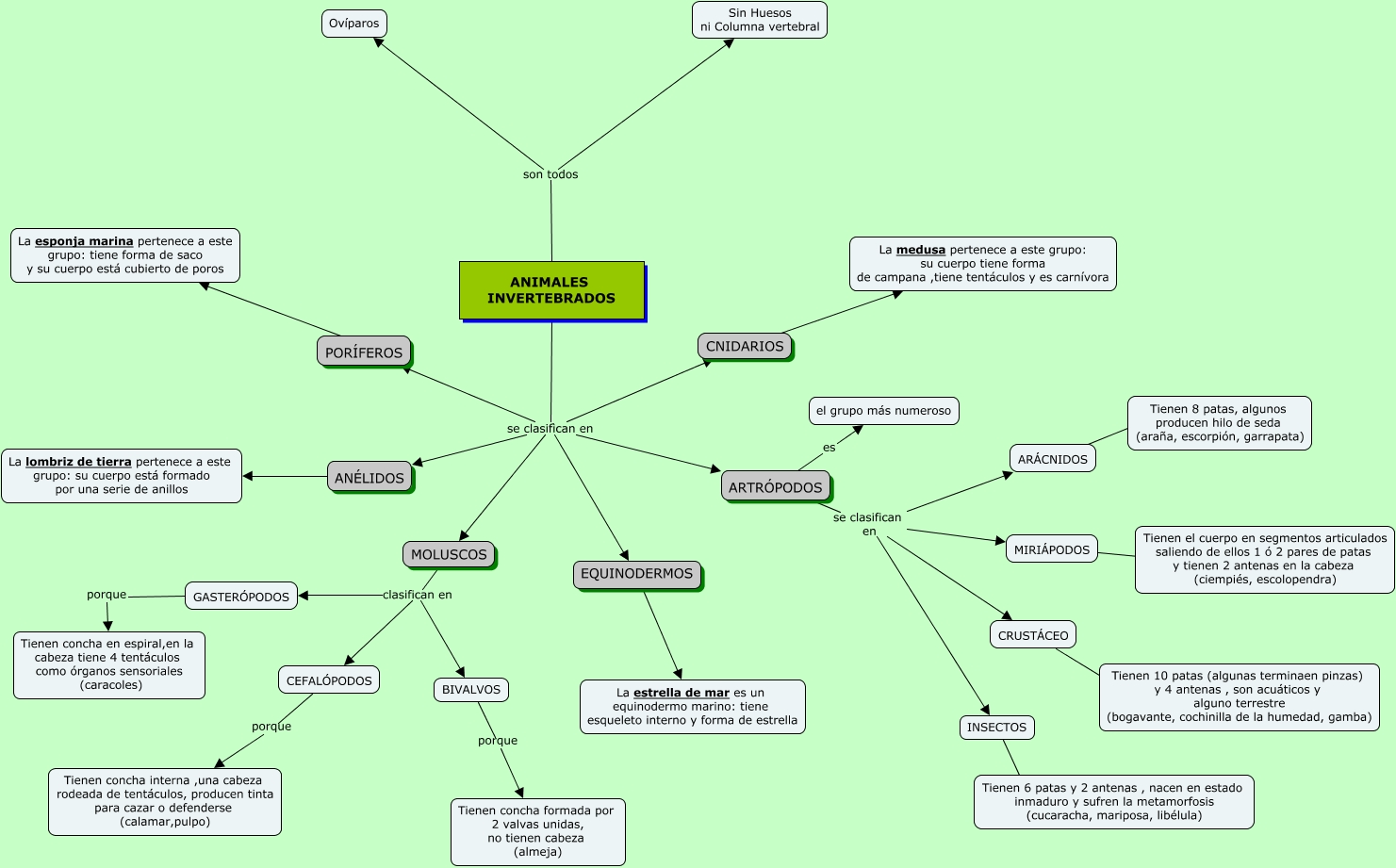 Este Cmap, tiene información relacionada con: Invertebrados, GASTERÓPODOS porque Tienen concha en espiral,en la cabeza tiene 4 tentáculos como órganos sensoriales (caracoles), BIVALVOS porque Tienen concha formada por 2 valvas unidas, no tienen cabeza (almeja), ARÁCNIDOS porque Tienen 8 patas, algunos producen hilo de seda (araña, escorpión, garrapata), INSECTOS porque Tienen 6 patas y 2 antenas , nacen en estado inmaduro y sufren la metamorfosis (cucaracha, mariposa, libélula), ARTRÓPODOS se clasifican en CRUSTÁCEO, ARTRÓPODOS es el grupo más numeroso, ANIMALES INVERTEBRADOS son todos Sin Huesos ni Columna vertebral, ANIMALES INVERTEBRADOS se clasifìcan en EQUINODERMOS, MIRIÁPODOS porque Tienen el cuerpo en segmentos articulados saliendo de ellos 1 ó 2 pares de patas y tienen 2 antenas en la cabeza (ciempiés, escolopendra), ARTRÓPODOS se clasifican en INSECTOS, MOLUSCOS clasifican en GASTERÓPODOS, CEFALÓPODOS porque Tienen concha interna ,una cabeza rodeada de tentáculos, producen tinta para cazar o defenderse (calamar,pulpo), ANIMALES INVERTEBRADOS se clasifìcan en MOLUSCOS, ANIMALES INVERTEBRADOS se clasifìcan en ANÉLIDOS, ANÉLIDOS ???? La lombriz de tierra pertenece a este grupo: su cuerpo está formado por una serie de anillos, ARTRÓPODOS se clasifican en ARÁCNIDOS, EQUINODERMOS ???? La estrella de mar es un equinodermo marino: tiene esqueleto interno y forma de estrella, MOLUSCOS clasifican en CEFALÓPODOS, ARTRÓPODOS se clasifican en MIRIÁPODOS, PORÍFEROS ???? La esponja marina pertenece a este grupo: tiene forma de saco y su cuerpo está cubierto de poros