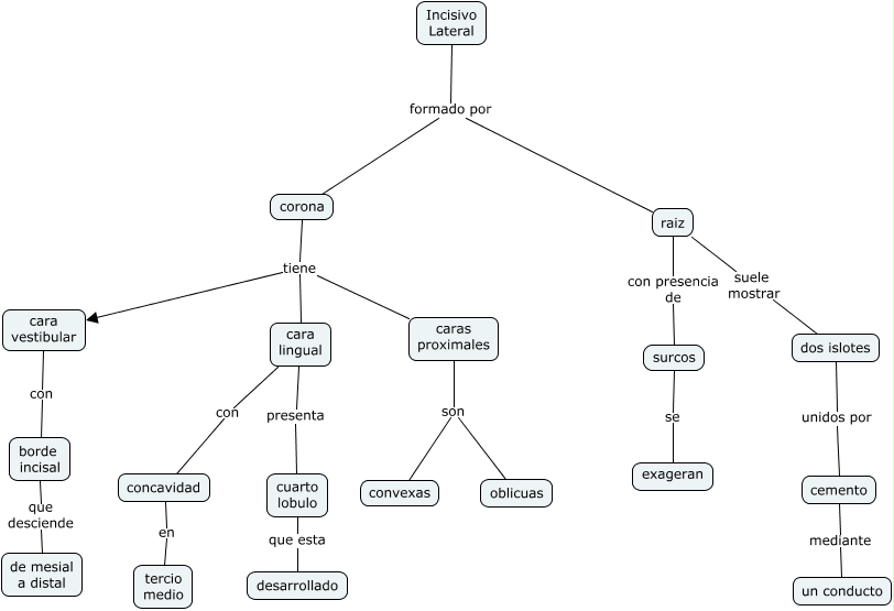 Este Cmap, tiene información relacionada con: incisivo lateral inf, surcos se exageran, cara lingual con concavidad, Incisivo Lateral formado por corona, corona tiene cara vestibular, cara vestibular con borde incisal, cuarto lobulo que esta desarrollado, Incisivo Lateral formado por raiz, corona tiene caras proximales, corona tiene cara lingual, concavidad en tercio medio, raiz suele mostrar dos islotes, dos islotes unidos por cemento, caras proximales son convexas, cara lingual presenta cuarto lobulo, caras proximales son oblicuas, cemento mediante un conducto, raiz con presencia de surcos, borde incisal que desciende de mesial a distal