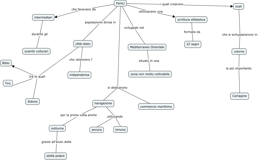 Questa Cmap, creata con IHMC CmapTools, contiene informazioni relative a: Fenici ( Barresi e Gagliardi), notturna grazie all'aiuto della stella polare, scrittura alfabetica formata da 22 segni, scali che si sviluppararono in colonie, Fenici popolazione divisa in città-stato, città-stato tra le quali Tiro, Fenici si dedicarono navigazione, navigazione utilizzando ancora, città-stato tra le quali Biblo, colonie la più importante Cartagine, Fenici si dedicarono commercio marittimo, navigazione utilizzando timone, intermediari durante gli scambi culturari, Fenici sviluppati nel Mediterraneo Orientale, Fenici che facevano da intermediari, Mediterraneo Orientale situato in una zona non molto coltivabile, Fenici i quali crearono scali, città-stato che ottennero l' indipendenza, navigazione per la prima volta anche notturna, Fenici utilizzavano una scrittura alfabetica, città-stato tra le quali Sidone