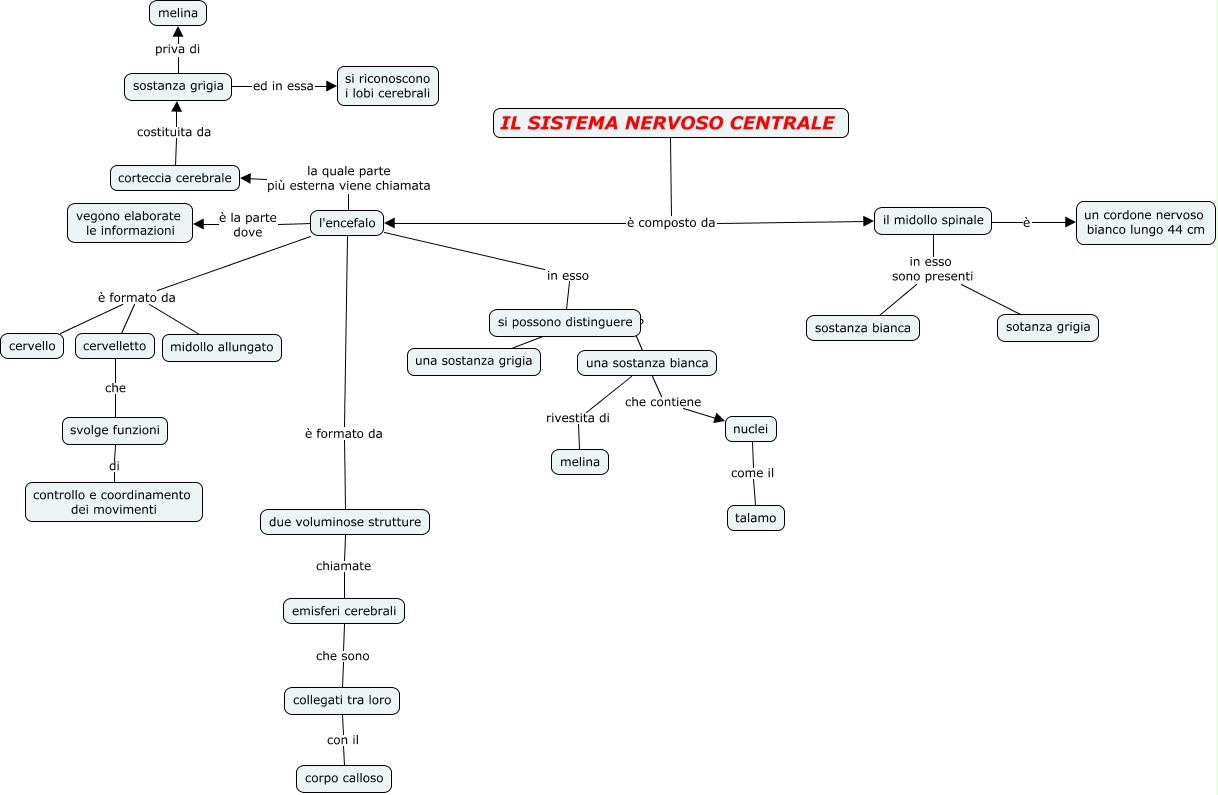 Questa Cmap, creata con IHMC CmapTools, contiene informazioni relative a: il sistema nervoso centrale, l'encefalo è formato da cervello, l'encefalo in esso si possono distinguere, il midollo spinale in esso sono presenti sostanza bianca, corteccia cerebrale costituita da sostanza grigia, una sostanza bianca che contiene nuclei, l'encefalo è formato da midollo allungato, nuclei come il talamo, IL SISTEMA NERVOSO CENTRALE è composto da il midollo spinale, emisferi cerebrali che sono collegati tra loro, si possono distinguere ???? una sostanza bianca, sostanza grigia priva di melina, collegati tra loro con il corpo calloso, svolge funzioni di controllo e coordinamento dei movimenti, IL SISTEMA NERVOSO CENTRALE è composto da l'encefalo, cervelletto che svolge funzioni, il midollo spinale è un cordone nervoso bianco lungo 44 cm, il midollo spinale in esso sono presenti sotanza grigia, l'encefalo è formato da cervelletto, l'encefalo è la parte dove vegono elaborate le informazioni, si possono distinguere ???? una sostanza grigia