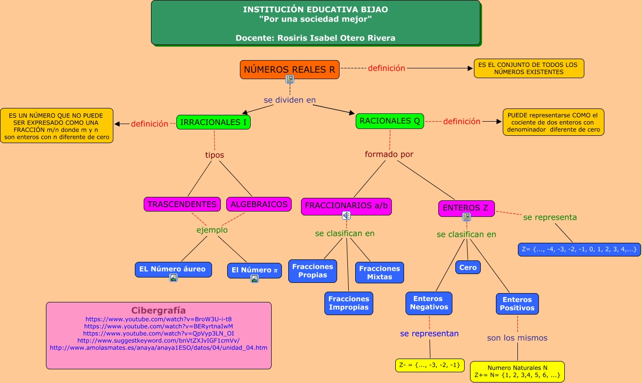 Este Cmap, tiene información relacionada con: NUMEROREALES, RACIONALES Q formado por FRACCIONARIOS a/b, TRASCENDENTES ejemplo EL Número áureo, NÚMEROS REALES R se dividen en IRRACIONALES I, ALGEBRAICOS ejemplo El Número π, RACIONALES Q definición PUEDE representarse COMO el cociente de dos enteros con denominador diferente de cero, TRASCENDENTES ejemplo El Número π, FRACCIONARIOS a/b se clasifican en Fracciones Mixtas, ENTEROS Z se clasifican en Enteros Negativos, Enteros Negativos se representan Z- = {..., -3, -2, -1}, IRRACIONALES I definición ES UN NÚMERO QUE NO PUEDE SER EXPRESADO COMO UNA FRACCIÓN m/n donde m y n son enteros con n diferente de cero, IRRACIONALES I tipos TRASCENDENTES, ENTEROS Z se representa Z= {..., -4, -3, -2, -1, 0, 1, 2, 3, 4,...}, NÚMEROS REALES R definición ES EL CONJUNTO DE TODOS LOS NÚMEROS EXISTENTES, FRACCIONARIOS a/b se clasifican en Fracciones Propias, ENTEROS Z se clasifican en Enteros Positivos, NÚMEROS REALES R se dividen en RACIONALES Q, ALGEBRAICOS ejemplo EL Número áureo, NÚMEROS REALES R se dividen en RACIONALES Q, Enteros Positivos son los mismos Numero Naturales N Z+= N= {1, 2, 3,4, 5, 6, ...}, ENTEROS Z se clasifican en Cero