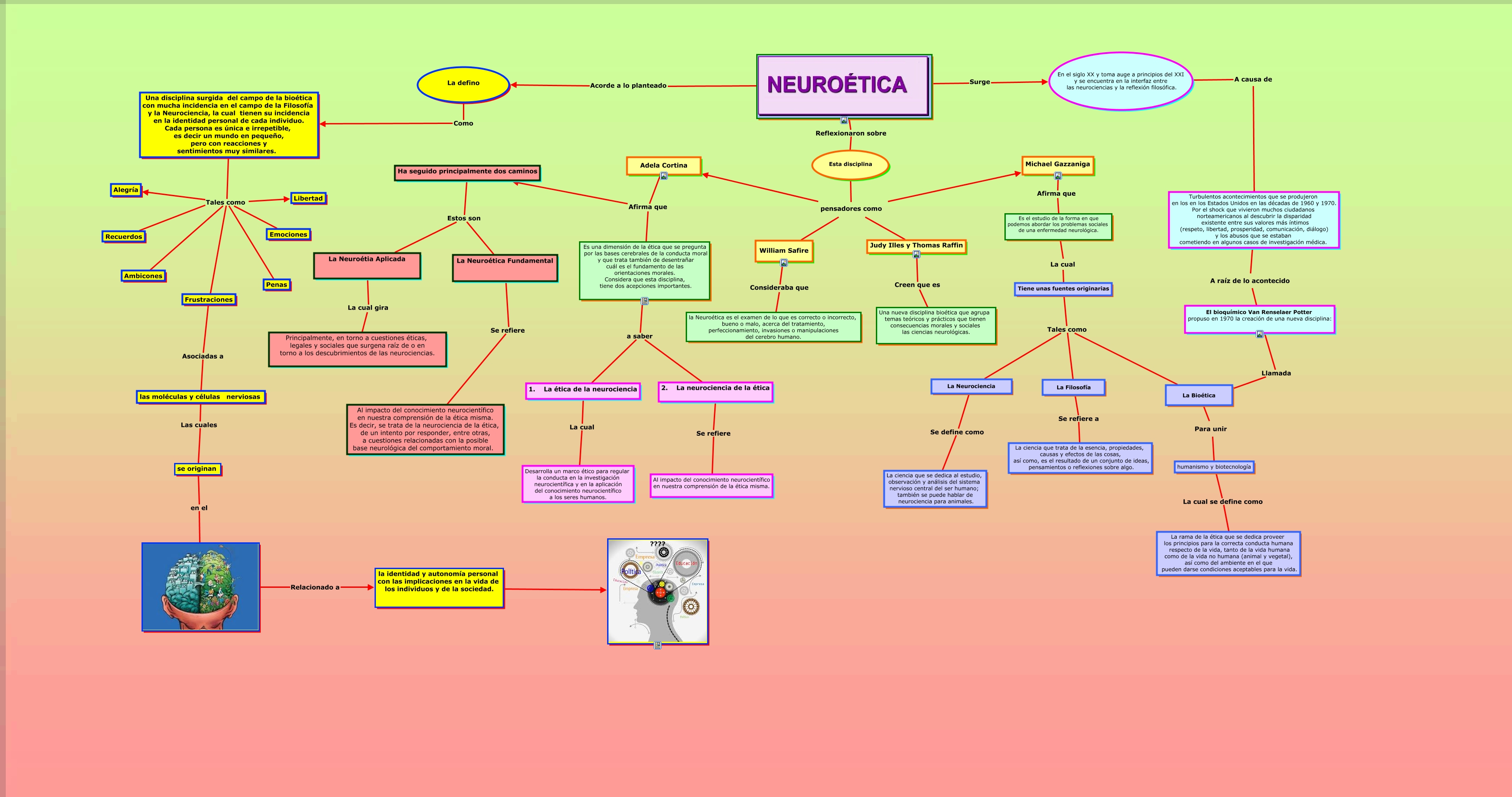 Este Cmap, tiene información relacionada con: LA NEUROÉTICA FUNLAM MARIHUT, Esta disciplina pensadores como Judy Illes y Thomas Raffin, Esta disciplina pensadores como Adela Cortina, se originan en el, Tiene unas fuentes originarias Tales como La Filosofía, Una disciplina surgida del campo de la bioética con mucha incidencia en el campo de la Filosofía y la Neurociencia, la cual tienen su incidencia en la identidad personal de cada individuo. Cada persona es única e irrepetible, es decir un mundo en pequeño, pero con reacciones y sentimientos muy similares. Tales como Emociones, El bioquímico Van Renselaer Potter propuso en 1970 la creación de una nueva disciplina: Llamada ????, 1. La ética de la neurociencia La cual Desarrolla un marco ético para regular la conducta en la investigación neurocientífica y en la aplicación del conocimiento neurocientífico a los seres humanos., Relacionado a la identidad y autonomía personal con las implicaciones en la vida de los individuos y de la sociedad., Acorde a lo planteado La defino, Michael Gazzaniga Afirma que Es el estudio de la forma en que podemos abordar los problemas sociales de una enfermedad neurológica., 2. La neurociencia de la ética Se refiere Al impacto del conocimiento neurocientífico en nuestra comprensión de la ética misma., Turbulentos acontecimientos que se produjeron en los en los Estados Unidos en las décadas de 1960 y 1970. Por el shock que vivieron muchos ciudadanos norteamericanos al descubrir la disparidad existente entre sus valores más íntimos (respeto, libertad, prosperidad, comunicación, diálogo) y los abusos que se estaban cometiendo en algunos casos de investigación médica. A raíz de lo acontecido El bioquímico Van Renselaer Potter propuso en 1970 la creación de una nueva disciplina:, Es el estudio de la forma en que podemos abordar los problemas sociales de una enfermedad neurológica. La cual Tiene unas fuentes originarias, La defino Como Una disciplina surgida del campo de la bioética con mucha incidencia en el campo de la Filosofía y la Neurociencia, la cual tienen su incidencia en la identidad personal de cada individuo. Cada persona es única e irrepetible, es decir un mundo en pequeño, pero con reacciones y sentimientos muy similares., Una disciplina surgida del campo de la bioética con mucha incidencia en el campo de la Filosofía y la Neurociencia, la cual tienen su incidencia en la identidad personal de cada individuo. Cada persona es única e irrepetible, es decir un mundo en pequeño, pero con reacciones y sentimientos muy similares. Tales como Penas, Una disciplina surgida del campo de la bioética con mucha incidencia en el campo de la Filosofía y la Neurociencia, la cual tienen su incidencia en la identidad personal de cada individuo. Cada persona es única e irrepetible, es decir un mundo en pequeño, pero con reacciones y sentimientos muy similares. Tales como Libertad, La Filosofía Se refiere a La ciencia que trata de la esencia, propiedades, causas y efectos de las cosas, así como, es el resultado de un conjunto de ideas, pensamientos o reflexiones sobre algo., Esta disciplina pensadores como Michael Gazzaniga, Ha seguido principalmente dos caminos Estos son La Neuroética Fundamental, Reflexionaron sobre Esta disciplina