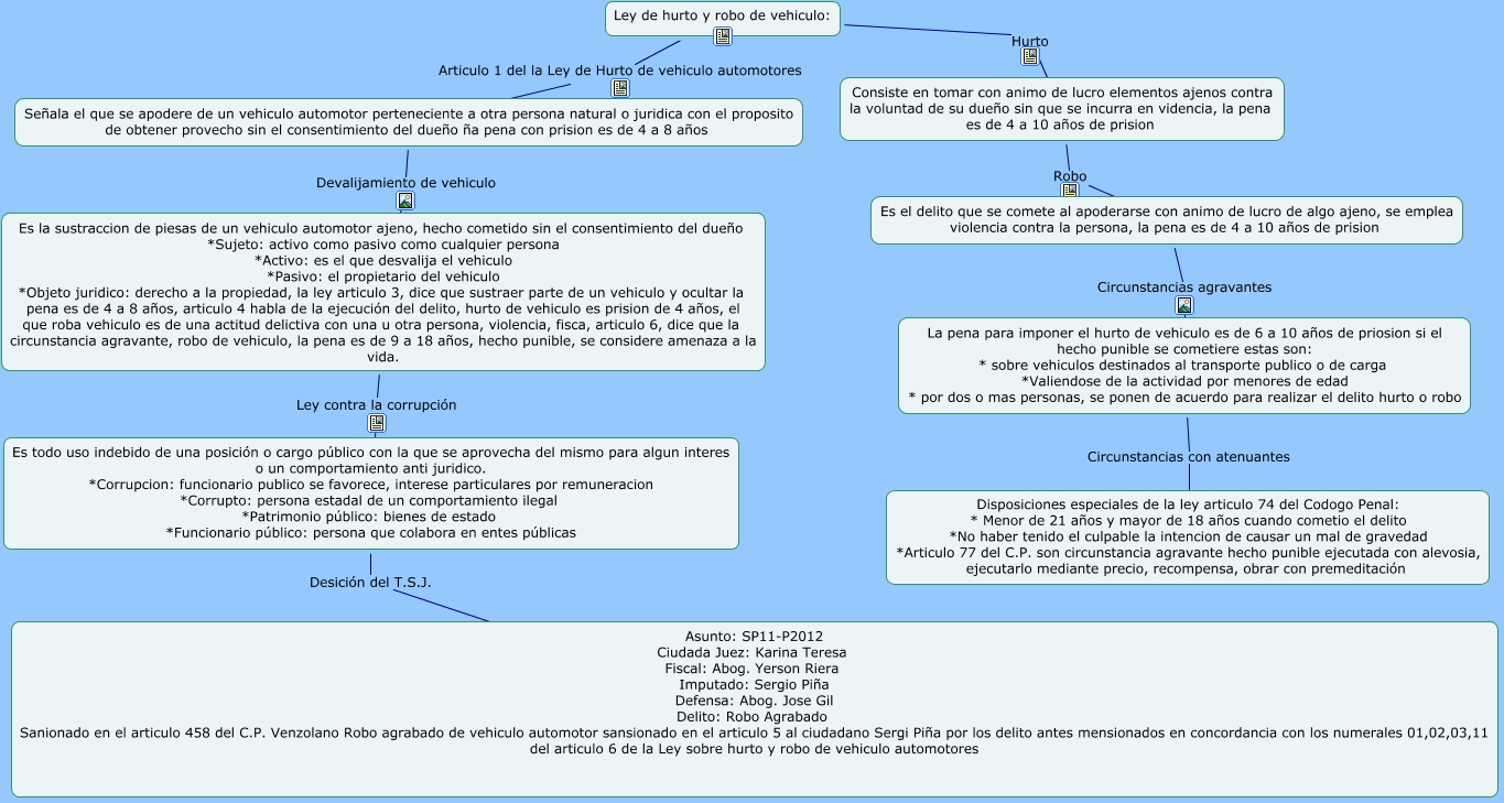 Este Cmap, tiene información relacionada con: ley de hurto y robo de vehiculo, Es todo uso indebido de una posición o cargo público con la que se aprovecha del mismo para algun interes o un comportamiento anti juridico. *Corrupcion: funcionario publico se favorece, interese particulares por remuneracion *Corrupto: persona estadal de un comportamiento ilegal *Patrimonio público: bienes de estado *Funcionario público: persona que colabora en entes públicas Desición del T.S.J. Asunto: SP11-P2012 Ciudada Juez: Karina Teresa Fiscal: Abog. Yerson Riera Imputado: Sergio Piña Defensa: Abog. Jose Gil Delito: Robo Agrabado Sanionado en el articulo 458 del C.P. Venzolano Robo agrabado de vehiculo automotor sansionado en el articulo 5 al ciudadano Sergi Piña por los delito antes mensionados en concordancia con los numerales 01,02,03,11 del articulo 6 de la Ley sobre hurto y robo de vehiculo automotores, Consiste en tomar con animo de lucro elementos ajenos contra la voluntad de su dueño sin que se incurra en videncia, la pena es de 4 a 10 años de prision Robo Es el delito que se comete al apoderarse con animo de lucro de algo ajeno, se emplea violencia contra la persona, la pena es de 4 a 10 años de prision, Ley de hurto y robo de vehiculo: Articulo 1 del la Ley de Hurto de vehiculo automotores Señala el que se apodere de un vehiculo automotor perteneciente a otra persona natural o juridica con el proposito de obtener provecho sin el consentimiento del dueño ña pena con prision es de 4 a 8 años, Señala el que se apodere de un vehiculo automotor perteneciente a otra persona natural o juridica con el proposito de obtener provecho sin el consentimiento del dueño ña pena con prision es de 4 a 8 años Devalijamiento de vehiculo Es la sustraccion de piesas de un vehiculo automotor ajeno, hecho cometido sin el consentimiento del dueño *Sujeto: activo como pasivo como cualquier persona *Activo: es el que desvalija el vehiculo *Pasivo: el propietario del vehiculo *Objeto juridico: derecho a la propiedad, la ley articulo 3, dice que sustraer parte de un vehiculo y ocultar la pena es de 4 a 8 años, articulo 4 habla de la ejecución del delito, hurto de vehiculo es prision de 4 años, el que roba vehiculo es de una actitud delictiva con una u otra persona, violencia, fisca, articulo 6, dice que la circunstancia agravante, robo de vehiculo, la pena es de 9 a 18 años, hecho punible, se considere amenaza a la vida., Es la sustraccion de piesas de un vehiculo automotor ajeno, hecho cometido sin el consentimiento del dueño *Sujeto: activo como pasivo como cualquier persona *Activo: es el que desvalija el vehiculo *Pasivo: el propietario del vehiculo *Objeto juridico: derecho a la propiedad, la ley articulo 3, dice que sustraer parte de un vehiculo y ocultar la pena es de 4 a 8 años, articulo 4 habla de la ejecución del delito, hurto de vehiculo es prision de 4 años, el que roba vehiculo es de una actitud delictiva con una u otra persona, violencia, fisca, articulo 6, dice que la circunstancia agravante, robo de vehiculo, la pena es de 9 a 18 años, hecho punible, se considere amenaza a la vida. Ley contra la corrupción Es todo uso indebido de una posición o cargo público con la que se aprovecha del mismo para algun interes o un comportamiento anti juridico. *Corrupcion: funcionario publico se favorece, interese particulares por remuneracion *Corrupto: persona estadal de un comportamiento ilegal *Patrimonio público: bienes de estado *Funcionario público: persona que colabora en entes públicas, La pena para imponer el hurto de vehiculo es de 6 a 10 años de priosion si el hecho punible se cometiere estas son: * sobre vehiculos destinados al transporte publico o de carga *Valiendose de la actividad por menores de edad * por dos o mas personas, se ponen de acuerdo para realizar el delito hurto o robo Circunstancias con atenuantes Disposiciones especiales de la ley articulo 74 del Codogo Penal: * Menor de 21 años y mayor de 18 años cuando cometio el delito *No haber tenido el culpable la intencion de causar un mal de gravedad *Articulo 77 del C.P. son circunstancia agravante hecho punible ejecutada con alevosia, ejecutarlo mediante precio, recompensa, obrar con premeditación, Ley de hurto y robo de vehiculo: Hurto Consiste en tomar con animo de lucro elementos ajenos contra la voluntad de su dueño sin que se incurra en videncia, la pena es de 4 a 10 años de prision, Es el delito que se comete al apoderarse con animo de lucro de algo ajeno, se emplea violencia contra la persona, la pena es de 4 a 10 años de prision Circunstancias agravantes La pena para imponer el hurto de vehiculo es de 6 a 10 años de priosion si el hecho punible se cometiere estas son: * sobre vehiculos destinados al transporte publico o de carga *Valiendose de la actividad por menores de edad * por dos o mas personas, se ponen de acuerdo para realizar el delito hurto o robo