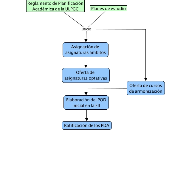Este Cmap, tiene información relacionada con: Procedimientos e interrelacion entre ellos, Planes de estudio Inicio Oferta de cursos de armonización, Oferta de cursos de armonización Elaboración del POD inicial en la EII, Reglamento de Planificación Académica de la ULPGC Inicio Oferta de cursos de armonización, Oferta de asignaturas optativas Elaboración del POD inicial en la EII, Reglamento de Planificación Académica de la ULPGC Inicio Asignación de asignaturas ámbitos, Elaboración del POD inicial en la EII Ratificación de los PDA, Asignación de asignaturas ámbitos Oferta de asignaturas optativas, Planes de estudio Inicio Asignación de asignaturas ámbitos