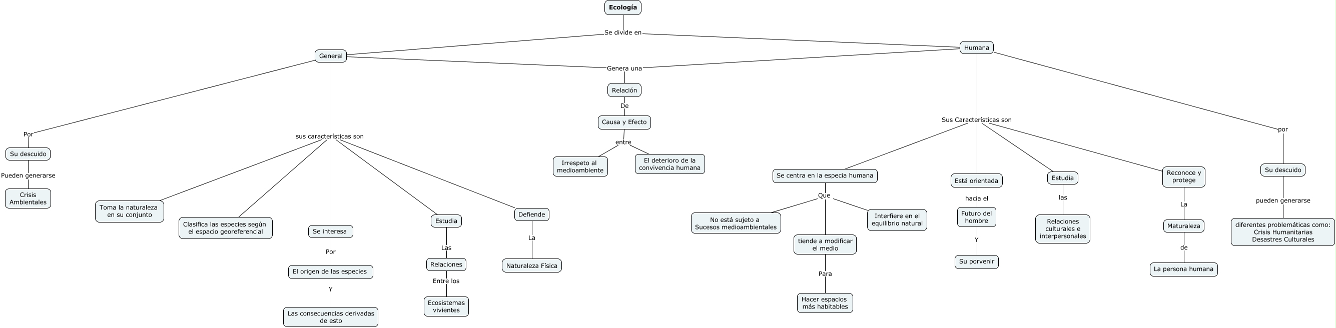 Este Cmap, tiene información relacionada con: ecología, General sus características son Estudia, General sus características son Clasifica las especies según el espacio georeferencial, General sus características son Defiende, Estudia Las Relaciones, Estudia las Relaciones culturales e interpersonales, tiende a modificar el medio Para Hacer espacios más habitables, Humana Sus Características son Está orientada, Ecología Se divide en General, General sus características son Se interesa, Relaciones Entre los Ecosistemas vivientes, Se centra en la especia humana Que No está sujeto a Sucesos medioambientales, Humana Sus Características son Estudia, Maturaleza de La persona humana, General Genera una Relación, Su descuido pueden generarse diferentes problemáticas como: Crisis Humanitarias Desastres Culturales, Humana Genera una Relación, Humana Sus Características son Se centra en la especia humana, Relación De Causa y Efecto, Causa y Efecto entre Irrespeto al medioambiente, Su descuido Pueden generarse Crisis Ambientales