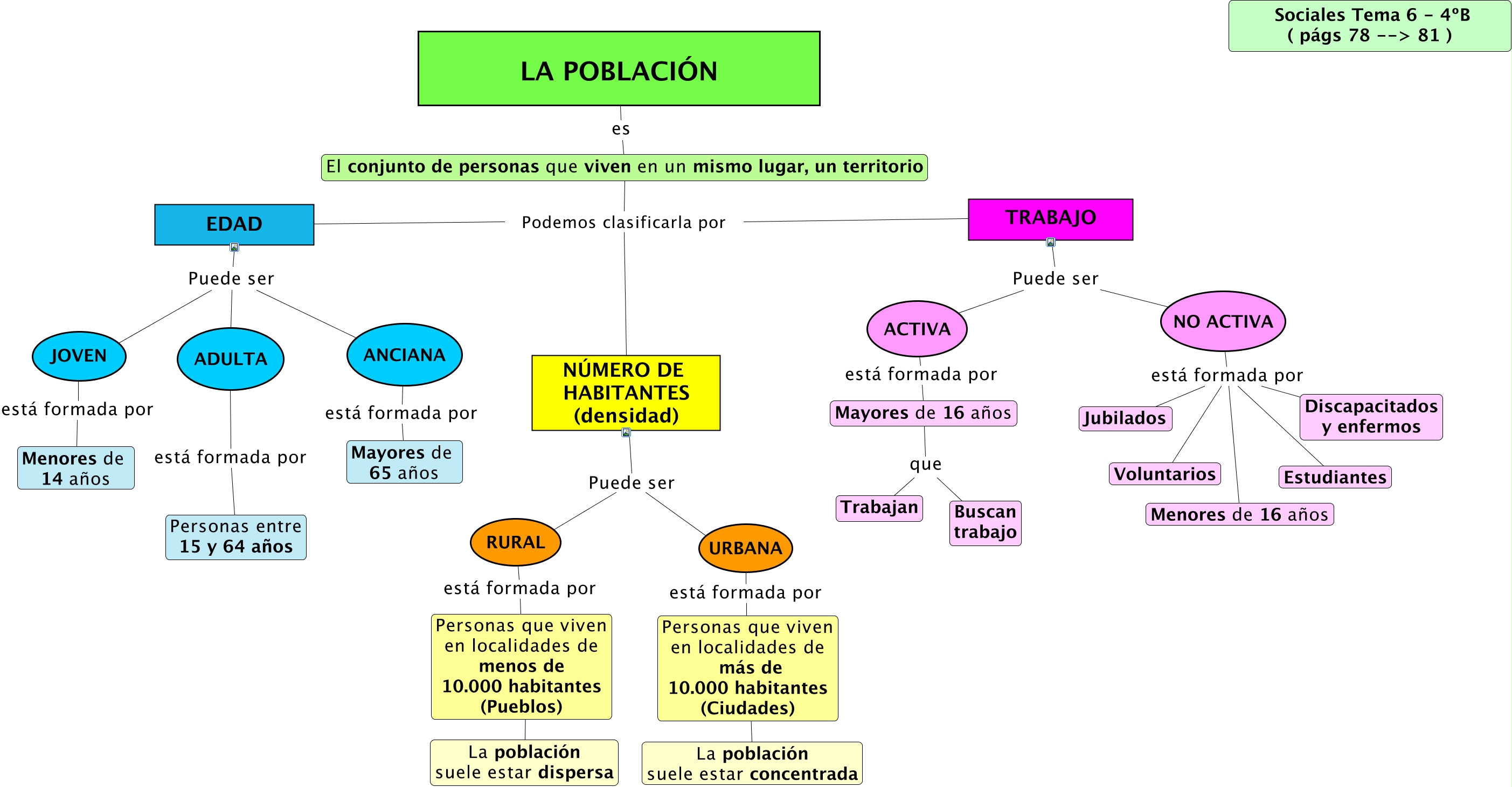 Este Cmap, tiene información relacionada con: LA POBLACIÓN, ACTIVA Puede ser NO ACTIVA, NÚMERO DE HABITANTES (densidad) Puede ser RURAL, NO ACTIVA está formada por Menores de 16 años, El conjunto de personas que viven en un mismo lugar, un territorio Podemos clasificarla por TRABAJO, ACTIVA está formada por Mayores de 16 años, NÚMERO DE HABITANTES (densidad) Puede ser URBANA, URBANA está formada por Personas que viven en localidades de más de 10.000 habitantes (Ciudades), RURAL está formada por Personas que viven en localidades de menos de 10.000 habitantes (Pueblos), ANCIANA está formada por Mayores de 65 años, NO ACTIVA está formada por Discapacitados y enfermos, El conjunto de personas que viven en un mismo lugar, un territorio Podemos clasificarla por EDAD, JOVEN Puede ser ADULTA, NO ACTIVA está formada por Voluntarios, ADULTA está formada por Personas entre 15 y 64 años, Mayores de 16 años que Trabajan, El conjunto de personas que viven en un mismo lugar, un territorio Podemos clasificarla por NÚMERO DE HABITANTES (densidad), JOVEN está formada por Menores de 14 años, Personas que viven en localidades de menos de 10.000 habitantes (Pueblos) ???? La población suele estar dispersa, NO ACTIVA está formada por Estudiantes, NO ACTIVA está formada por Jubilados