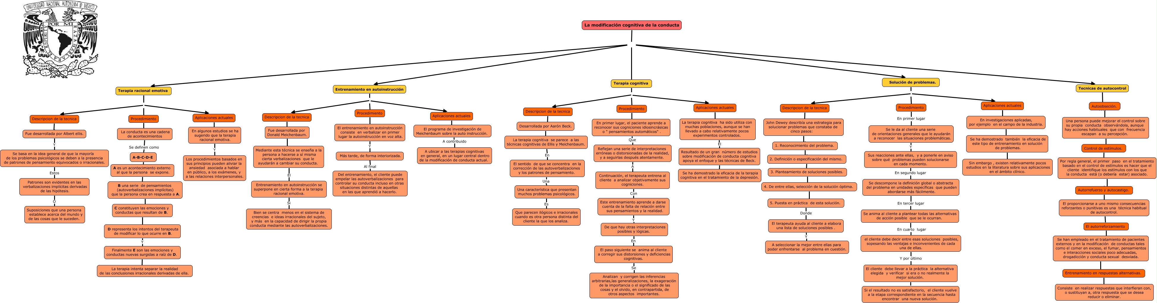 Este Cmap, tiene información relacionada con: Modificacion cognitiva de la conducta, Aplicaciones actuales ???? En investigaciones aplicadas, por ejemplo en el campo de la industria., Procedimiento ???? En primer lugar, el paciente aprende a reconocer sus cogniciones idiosincrásicas o " pensamientos automáticos" ., Procedimiento ???? El entrenamiento en autoinstrucción consiste en verbalizar en primer lugar la autoinstrucción en voz alta., Autorrefuerzo y autocastigo. ???? El proporcionarse a uno mismo consecuencias reforzantes o punitivas es una técnica habitual de autocontrol., De que hay otras interpretaciones posibles y lógicas. En El paso siguiente se anima al cliente a corregir sus distorsiones y deficiencias cognitivas., Este entrenamiento aprende a darse cuenta de la falta de relación entre sus pensamientos y la realidad. Y De que hay otras interpretaciones posibles y lógicas., Aplicaciones actuales ???? En algunos estudios se ha sugerido que la terapia racional emotiva., B una serie de pensamientos (autoverbalizaciones implícitas) que la persona crea en respuesta a A. ???? C constituyen las emociones y conductas que resultan de B., Terapia racional emotiva Descripcion de la tecnica, Descripcion de la tecnica ???? John Dewey describía una estrategia para solucionar problemas que constaba de cinco pasos:, En primer lugar, el paciente aprende a reconocer sus cogniciones idiosincrásicas o " pensamientos automáticos" . Que Reflejan una serie de interpretaciones erróneas o distorsionadas de la realidad, y a seguirlas después atentamente., D representa los intentos del terapeuta de modificar lo que ocurre en B. Y Finalmente E son las emociones y conductas nuevas surgidas a raíz de D., La modificación cognitiva de la conducta Entrenamiento en autoinstrucción, La modificación cognitiva de la conducta Terapia cognitiva, Procedimiento ???? La conducta es una cadena de acontecimientos, Finalmente E son las emociones y conductas nuevas surgidas a raíz de D. ???? La terapia intenta separar la realidad de las conclusiones irracionales derivadas de ella., Se ha demostrado también la eficacia de este tipo de entrenamiento en solución de problemas. ???? Sin embargo , existen relativamente pocos estudios en la literatura sobre sus aplicaciones en el ámbito clínico., La terapia cognitiva ha sido utiliza con muchas poblaciones, aunque se han llevado a cabo relativamente pocos experimentos controlados. El Resultado de un gran número de estudios sobre modificación de conducta cognitiva apoya el enfoque y las técnicas de Beck., Descripcion de la tecnica ???? Fue desarrollada por Albert ellis., La terapia cognitiva se parece a las técnicas cognitivas de Ellis y Meichenbaum. En El sentido de que se concentra en la corrección de las autoverbalizaciones y los patrones de pensamiento.