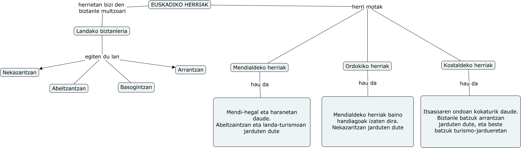 IHMC CmapTools-ekin sortu den kontzeptu-mapa honek honi buruzko informazioa du: Biztanleria 3 (osatuta), EUSKADIKO HERRIAK herri motak Kostaldeko herriak, Kostaldeko herriak hau da Itsasoaren ondoan kokaturik daude. Biztanle batzuk arrantzan jarduten dute, eta beste batzuk turismo-jardueretan, Landako biztanleria egiten du lan Nekazaritzan, Landako biztanleria egiten du lan Basogintzan, Landako biztanleria egiten du lan Abeltzantzan, EUSKADIKO HERRIAK herrietan bizi den biztanle multzoari Landako biztanleria, Ordokiko herriak hau da Mendialdeko herriak baino handiagoak izaten dira. Nekazaritzan jarduten dute, EUSKADIKO HERRIAK herri motak Ordokiko herriak, EUSKADIKO HERRIAK herri motak Mendialdeko herriak, Mendialdeko herriak hau da Mendi-hegal eta haranetan daude. Abeltzaintzan eta landa-turismoan jarduten dute, Landako biztanleria egiten du lan Arrantzan