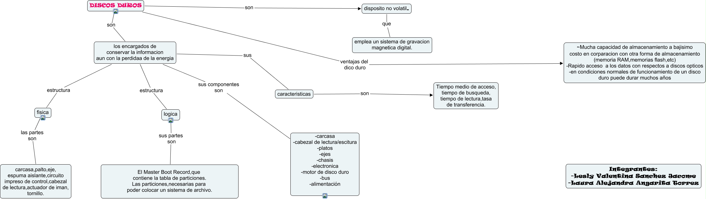 Este Cmap, tiene información relacionada con: disco duros, los encargados de conservar la informacion aun con la perdidaa de la energia sus caracteristicas, caracteristicas son Tiempo medio de acceso, tiempo de busqueda, tiempo de lectura,tasa de transferencia., DISCOS DUROS son los encargados de conservar la informacion aun con la perdidaa de la energia, fisica las partes son carcasa,palto,eje, espuma aislante,circuito impreso de control,cabezal de lectura,actuador de iman, tornillo., los encargados de conservar la informacion aun con la perdidaa de la energia estructura fisica, los encargados de conservar la informacion aun con la perdidaa de la energia estructura logica, DISCOS DUROS ventajas del dico duro -Mucha capacidad de almacenamiento a bajisimo costo en corparacion con otra forma de almacenamiento (memoria RAM,memorias flash,etc) -Rapido acceso a los datos con respectos a discos opticos -en condiciones normales de funcionamiento de un disco duro puede durar muchos años, disposito no volatil. que emplea un sistema de gravacion magnetica digital., logica sus partes son El Master Boot Record,que contiene la tabla de particiones. Las particiones,necesarias para poder colocar un sistema de archivo., DISCOS DUROS son disposito no volatil., los encargados de conservar la informacion aun con la perdidaa de la energia sus componentes son -carcasa -cabezal de lectura/escitura -platos -ejes -chasis -electronica -motor de disco duro -bus -alimentación