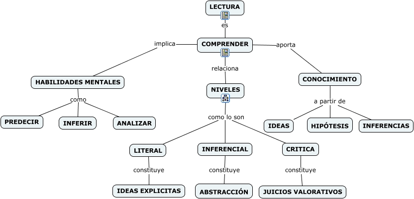 Este Cmap, tiene información relacionada con: LECTURA, CONOCIMIENTO a partir de INFERENCIAS, HABILIDADES MENTALES como INFERIR, CONOCIMIENTO a partir de IDEAS, CRITICA constituye JUICIOS VALORATIVOS, COMPRENDER relaciona NIVELES, LITERAL constituye IDEAS EXPLICITAS, NIVELES como lo son CRITICA, LECTURA es COMPRENDER, NIVELES como lo son LITERAL, COMPRENDER aporta CONOCIMIENTO, CONOCIMIENTO a partir de HIPÓTESIS, COMPRENDER implica HABILIDADES MENTALES, HABILIDADES MENTALES como PREDECIR, HABILIDADES MENTALES como ANALIZAR, INFERENCIAL constituye ABSTRACCIÓN, NIVELES como lo son INFERENCIAL