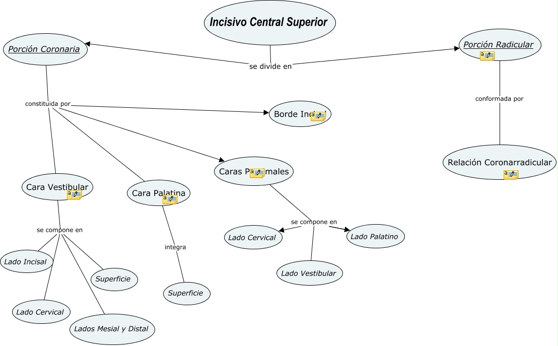 Este Cmap, tiene información relacionada con: cmap je ics, Porción Radicular conformada por Relación Coronarradicular, Cara Palatina integra Superficie, Cara Vestibular se compone en Superficie, Caras Proximales se compone en Lado Palatino, Incisivo Central Superior se divide en Porción Radicular, Porción Coronaria constituida por Caras Proximales, Caras Proximales se compone en Lado Vestibular, Porción Coronaria constituida por Cara Palatina, Cara Vestibular se compone en Lado Cervical, Porción Coronaria constituida por Cara Vestibular, Caras Proximales se compone en Lado Cervical, Caras Proximales se compone en Lado Palatino, Porción Coronaria constituida por Borde Incisal, Cara Vestibular se compone en Lado Incisal, Cara Vestibular se compone en Lados Mesial y Distal, Incisivo Central Superior se divide en Porción Coronaria