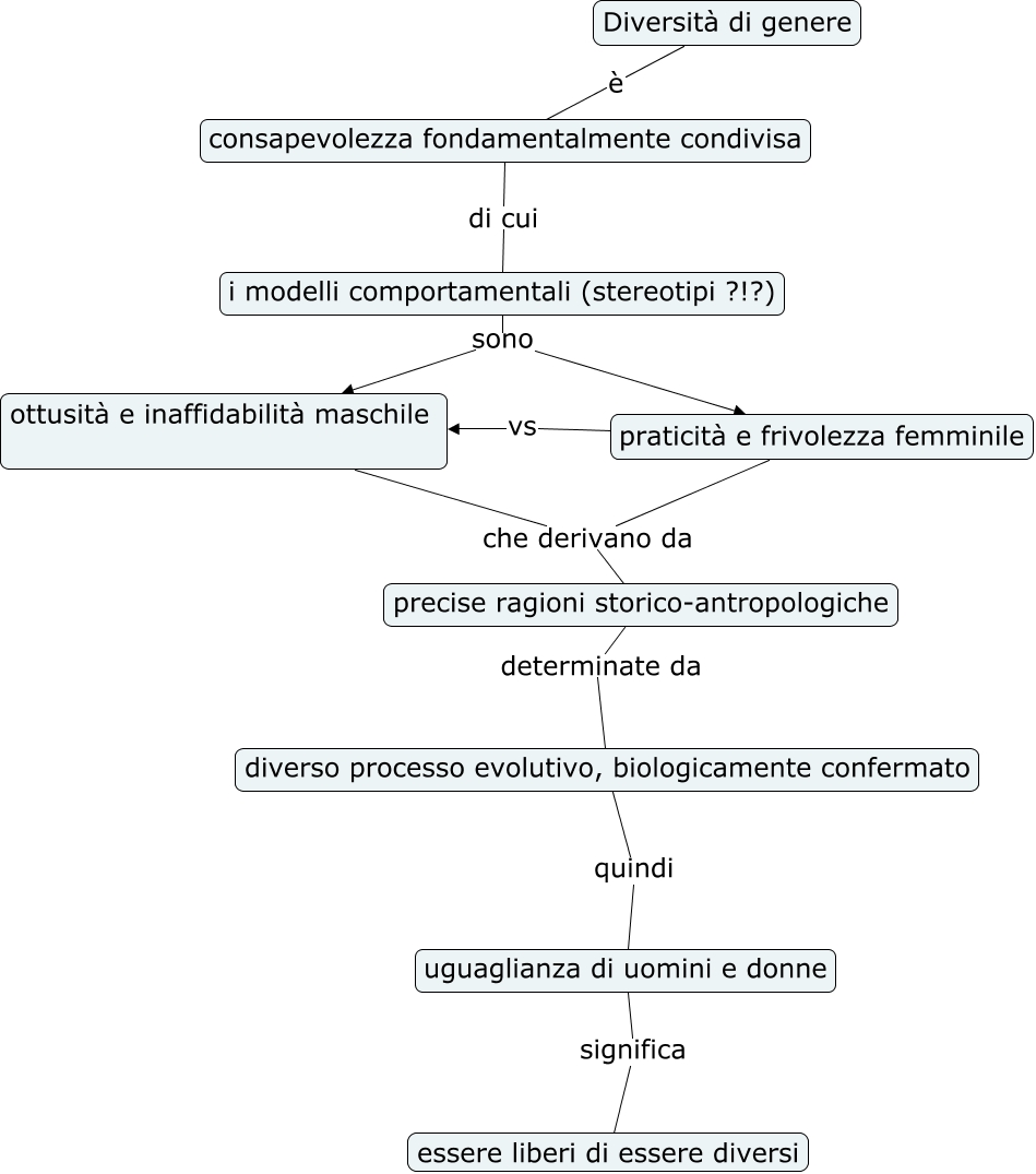 Questa Cmap, creata con IHMC CmapTools, contiene informazioni relative a: gruppo 5, ottusità e inaffidabilità maschile che derivano da precise ragioni storico-antropologiche, diverso processo evolutivo, biologicamente confermato quindi uguaglianza di uomini e donne, uguaglianza di uomini e donne significa essere liberi di essere diversi, i modelli comportamentali (stereotipi ?!?) sono ottusità e inaffidabilità maschile, i modelli comportamentali (stereotipi ?!?) sono praticità e frivolezza femminile, precise ragioni storico-antropologiche determinate da diverso processo evolutivo, biologicamente confermato, praticità e frivolezza femminile vs ottusità e inaffidabilità maschile, Diversità di genere è consapevolezza fondamentalmente condivisa, praticità e frivolezza femminile che derivano da precise ragioni storico-antropologiche, consapevolezza fondamentalmente condivisa di cui i modelli comportamentali (stereotipi ?!?)