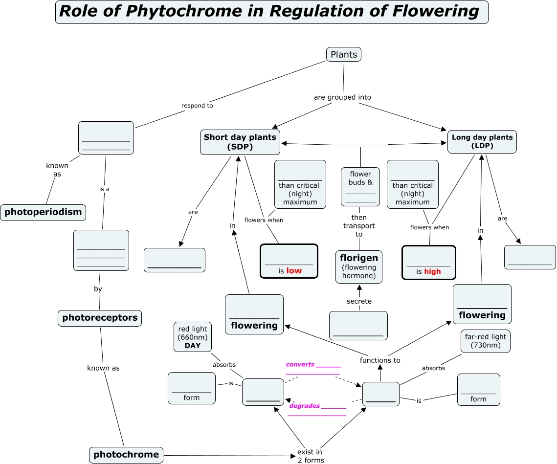 This Concept Map, created with IHMC CmapTools, has information related to: Regulation of flowering quiz less degree directedness, Short day plants (SDP) are ___________, Short day plants (SDP) flowers when _________ than critical (night) maximum, _________ secrete florigen (flowering hormone), Long day plants (LDP) flowers when _________ than critical (night) maximum, ______ converts ______ _____________ ______, flower buds & _______ _______ ____________ Short day plants (SDP), Long day plants (LDP) are __________, ______ degrades ______ ______________ ______, ______ functions to ________ flowering, Short day plants (SDP) flowers when ___________ is low, ___________ ___________ ___________ by photoreceptors, ________ flowering in Short day plants (SDP), photochrome known as photoreceptors, ______ is ________ form, ______ is _________ form, ______ functions to ________ flowering, ________ flowering in Long day plants (LDP), Plants respond to ___________ ___________, Long day plants (LDP) flowers when __________ is high, photochrome exist in 2 forms ______