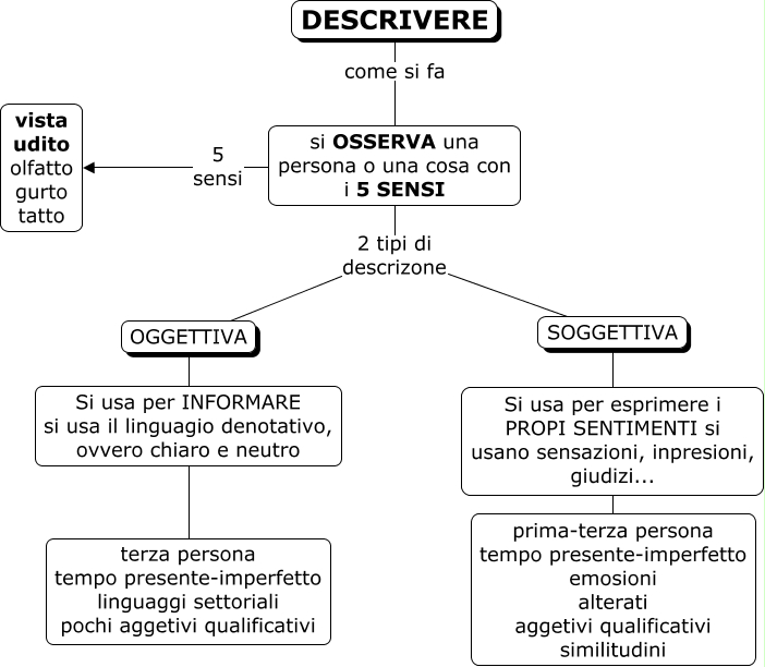 Questa Cmap, creata con IHMC CmapTools, contiene informazioni relative a: DESCRIVERE, Si usa per esprimere i PROPI SENTIMENTI si usano sensazioni, inpresioni, giudizi... prima-terza persona tempo presente-imperfetto emosioni alterati aggetivi qualificativi similitudini, Si usa per INFORMARE si usa il linguagio denotativo, ovvero chiaro e neutro terza persona tempo presente-imperfetto linguaggi settoriali pochi aggetivi qualificativi, si OSSERVA una persona o una cosa con i 5 SENSI 5 sensi vista udito olfatto gurto tatto, si OSSERVA una persona o una cosa con i 5 SENSI 2 tipi di descrizone OGGETTIVA, OGGETTIVA Si usa per INFORMARE si usa il linguagio denotativo, ovvero chiaro e neutro, SOGGETTIVA Si usa per esprimere i PROPI SENTIMENTI si usano sensazioni, inpresioni, giudizi..., DESCRIVERE come si fa si OSSERVA una persona o una cosa con i 5 SENSI, si OSSERVA una persona o una cosa con i 5 SENSI 2 tipi di descrizone SOGGETTIVA