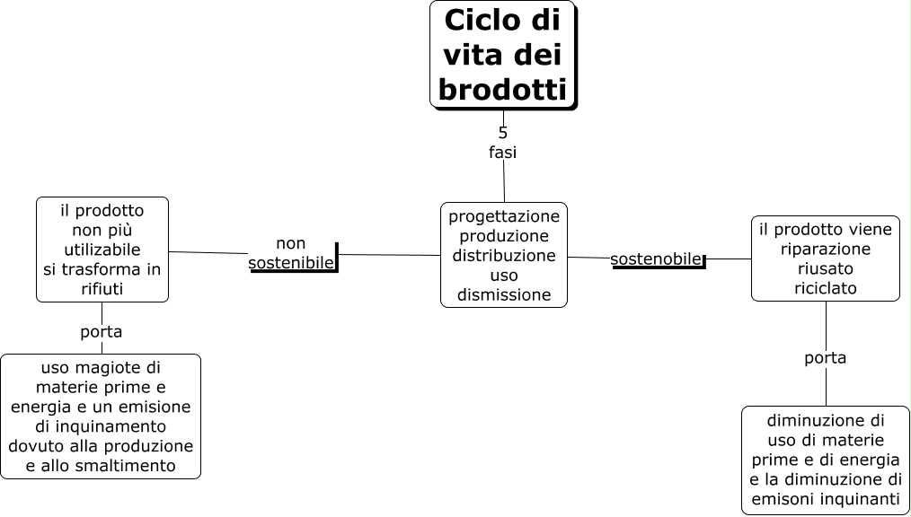 Questa Cmap, creata con IHMC CmapTools, contiene informazioni relative a: Ciclo di vita dei brodotti, Ciclo di vita dei brodotti 5 fasi progettazione produzione distribuzione uso dismissione, progettazione produzione distribuzione uso dismissione non sostenibile il prodotto non più utilizabile si trasforma in rifiuti, il prodotto viene riparazione riusato riciclato porta diminuzione di uso di materie prime e di energia e la diminuzione di emisoni inquinanti, il prodotto non più utilizabile si trasforma in rifiuti porta uso magiote di materie prime e energia e un emisione di inquinamento dovuto alla produzione e allo smaltimento, progettazione produzione distribuzione uso dismissione sostenobile il prodotto viene riparazione riusato riciclato