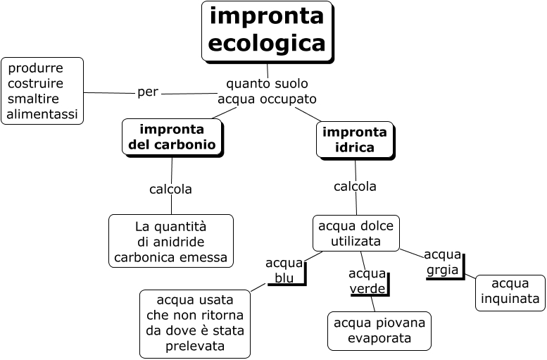 Questa Cmap, creata con IHMC CmapTools, contiene informazioni relative a: impronta ecologica, acqua dolce utilizata acqua grgia acqua inquinata, impronta ecologica quanto suolo acqua occupato per, acqua dolce utilizata acqua verde acqua piovana evaporata, impronta idrica calcola acqua dolce utilizata, impronta del carbonio calcola La quantità di anidride carbonica emessa, acqua dolce utilizata acqua blu acqua usata che non ritorna da dove è stata prelevata, impronta ecologica quanto suolo acqua occupato impronta del carbonio, impronta ecologica quanto suolo acqua occupato impronta idrica, per produrre costruire smaltire alimentassi