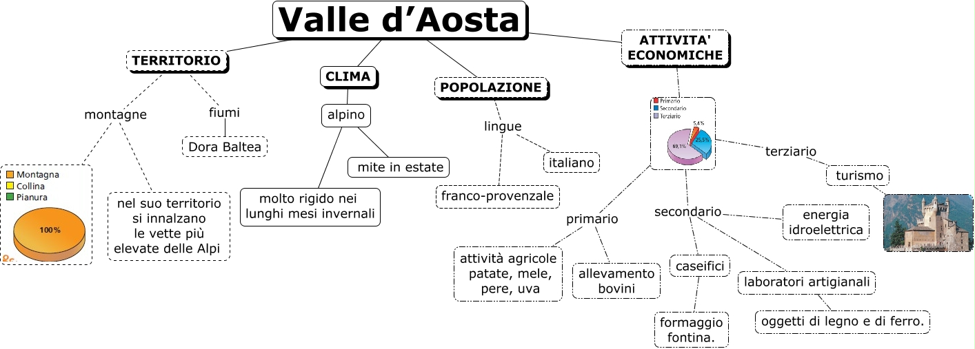 Questa Cmap, creata con IHMC CmapTools, contiene informazioni relative a: val d'aosta, alpino mite in estate, secondario energia idroelettrica, caseifici formaggio fontina., TERRITORIO fiumi Dora Baltea, POPOLAZIONE lingue italiano, POPOLAZIONE lingue franco-provenzale, Valle d’Aosta POPOLAZIONE, Valle d’Aosta TERRITORIO, alpino molto rigido nei lunghi mesi invernali, laboratori artigianali oggetti di legno e di ferro., secondario laboratori artigianali, primario attività agricole patate, mele, pere, uva, primario allevamento bovini, TERRITORIO montagne, Valle d’Aosta ATTIVITA' ECONOMICHE, Valle d’Aosta CLIMA, secondario caseifici, turismo, CLIMA alpino, terziario turismo