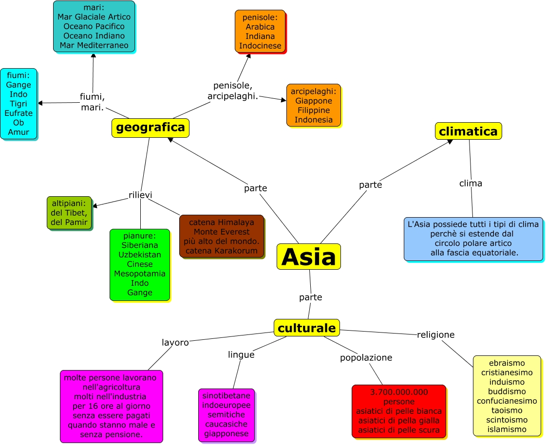 Questa Cmap, creata con IHMC CmapTools, contiene informazioni relative a: Asia colorata, culturale lingue sinotibetane indoeuropee semitiche caucasiche giapponese, geografica penisole, arcipelaghi. arcipelaghi: Giappone Filippine Indonesia, climatica clima L'Asia possiede tutti i tipi di clima perchè si estende dal circolo polare artico alla fascia equatoriale., geografica fiumi, mari. mari: Mar Glaciale Artico Oceano Pacifico Oceano Indiano Mar Mediterraneo, culturale lavoro molte persone lavorano nell'agricoltura molti nell'industria per 16 ore al giorno senza essere pagati quando stanno male e senza pensione., culturale religione ebraismo cristianesimo induismo buddismo confucianesimo taoismo scintoismo islamismo, geografica rilievi pianure: Siberiana Uzbekistan Cinese Mesopotamia Indo Gange, geografica fiumi, mari. fiumi: Gange Indo Tigri Eufrate Ob Amur, Asia parte culturale, geografica rilievi catena Himalaya Monte Everest più alto del mondo. catena Karakorum, geografica penisole, arcipelaghi. penisole: Arabica Indiana Indocinese, Asia parte climatica, culturale popolazione 3.700.000.000 persone asiatici di pelle bianca asiatici di pella gialla asiatici di pelle scura, geografica rilievi altipiani: del Tibet, del Pamir, Asia parte geografica