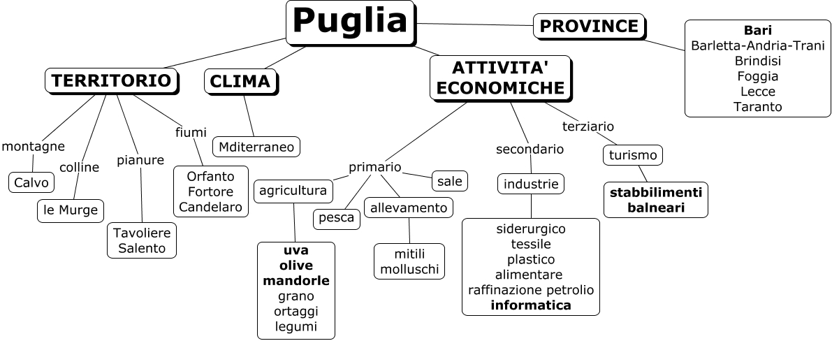 Questa Cmap, creata con IHMC CmapTools, contiene informazioni relative a: Puglia, ATTIVITA' ECONOMICHE primario agricultura, industrie siderurgico tessile plastico alimentare raffinazione petrolio informatica, Puglia PROVINCE, ATTIVITA' ECONOMICHE primario pesca, PROVINCE Bari Barletta-Andria-Trani Brindisi Foggia Lecce Taranto, Puglia CLIMA, TERRITORIO montagne Calvo, Puglia TERRITORIO, TERRITORIO pianure Tavoliere Salento, ATTIVITA' ECONOMICHE terziario turismo, agricultura uva olive mandorle grano ortaggi legumi, ATTIVITA' ECONOMICHE primario allevamento, Puglia ATTIVITA' ECONOMICHE, TERRITORIO colline le Murge, turismo stabbilimenti balneari, CLIMA Mditerraneo, ATTIVITA' ECONOMICHE secondario industrie, allevamento mitili molluschi, ATTIVITA' ECONOMICHE primario sale, TERRITORIO fiumi Orfanto Fortore Candelaro