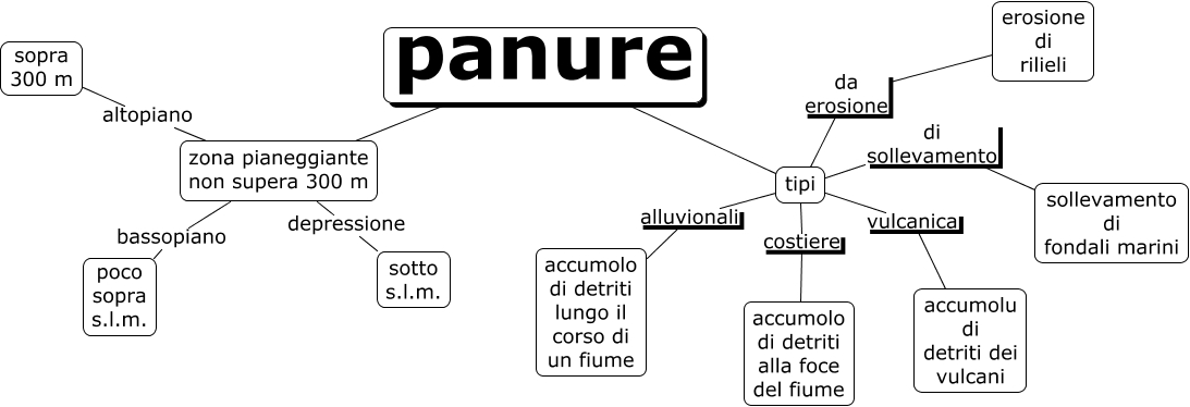 Questa Cmap, creata con IHMC CmapTools, contiene informazioni relative a: panure, panure tipi, zona pianeggiante non supera 300 m depressione sotto s.l.m., tipi alluvionali accumolo di detriti lungo il corso di un fiume, zona pianeggiante non supera 300 m bassopiano poco sopra s.l.m., tipi costiere accumolo di detriti alla foce del fiume, tipi da erosione erosione di rilieli, tipi vulcanica accumolu di detriti dei vulcani, zona pianeggiante non supera 300 m altopiano sopra 300 m, tipi di sollevamento sollevamento di fondali marini, panure zona pianeggiante non supera 300 m