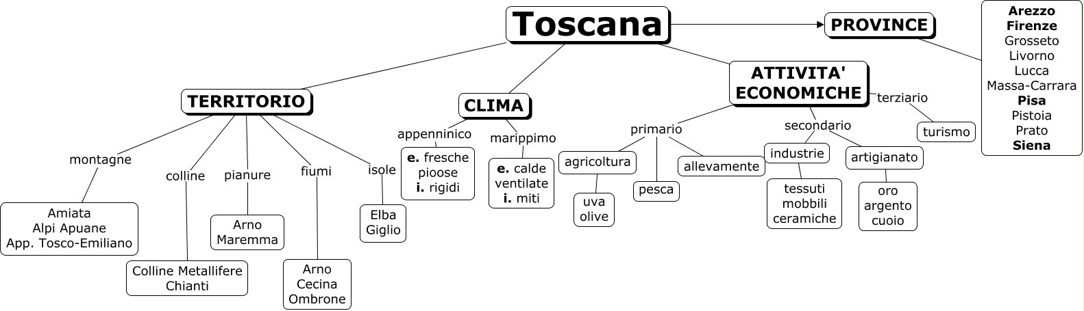 Questa Cmap, creata con IHMC CmapTools, contiene informazioni relative a: toscana, industrie tessuti mobbili ceramiche, CLIMA appenninico e. fresche pioose i. rigidi, ATTIVITA' ECONOMICHE primario agricoltura, ATTIVITA' ECONOMICHE secondario artigianato, TERRITORIO isole Elba Giglio, agricoltura uva olive, CLIMA marippimo e. calde ventilate i. miti, Toscana CLIMA, TERRITORIO montagne Amiata Alpi Apuane App. Tosco-Emiliano, Toscana TERRITORIO, TERRITORIO pianure Arno Maremma, Toscana PROVINCE, ATTIVITA' ECONOMICHE terziario turismo, Toscana ATTIVITA' ECONOMICHE, ATTIVITA' ECONOMICHE primario allevamente, ATTIVITA' ECONOMICHE primario pesca, TERRITORIO colline Colline Metallifere Chianti, artigianato oro argento cuoio, ATTIVITA' ECONOMICHE secondario industrie, PROVINCE Arezzo Firenze Grosseto Livorno Lucca Massa-Carrara Pisa Pistoia Prato Siena