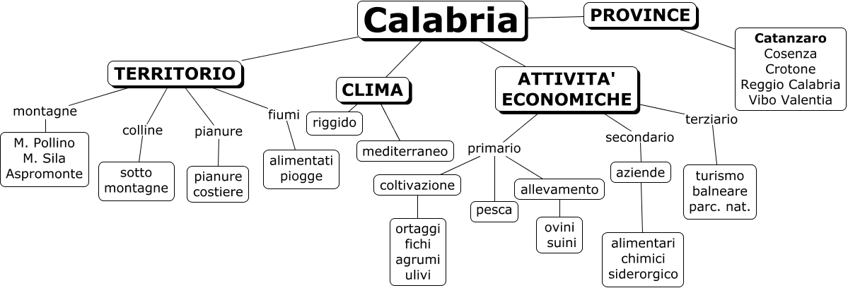 Questa Cmap, creata con IHMC CmapTools, contiene informazioni relative a: Calabria, PROVINCE Catanzaro Cosenza Crotone Reggio Calabria Vibo Valentia, aziende alimentari chimici siderorgico, TERRITORIO fiumi alimentati piogge, TERRITORIO pianure pianure costiere, allevamento ovini suini, coltivazione ortaggi fichi agrumi ulivi, Calabria TERRITORIO, TERRITORIO colline sotto montagne, ATTIVITA' ECONOMICHE terziario turismo balneare parc. nat., ATTIVITA' ECONOMICHE primario coltivazione, Calabria CLIMA, ATTIVITA' ECONOMICHE primario allevamento, Calabria PROVINCE, ATTIVITA' ECONOMICHE primario pesca, CLIMA riggido, TERRITORIO montagne M. Pollino M. Sila Aspromonte, CLIMA mediterraneo, ATTIVITA' ECONOMICHE secondario aziende, Calabria ATTIVITA' ECONOMICHE