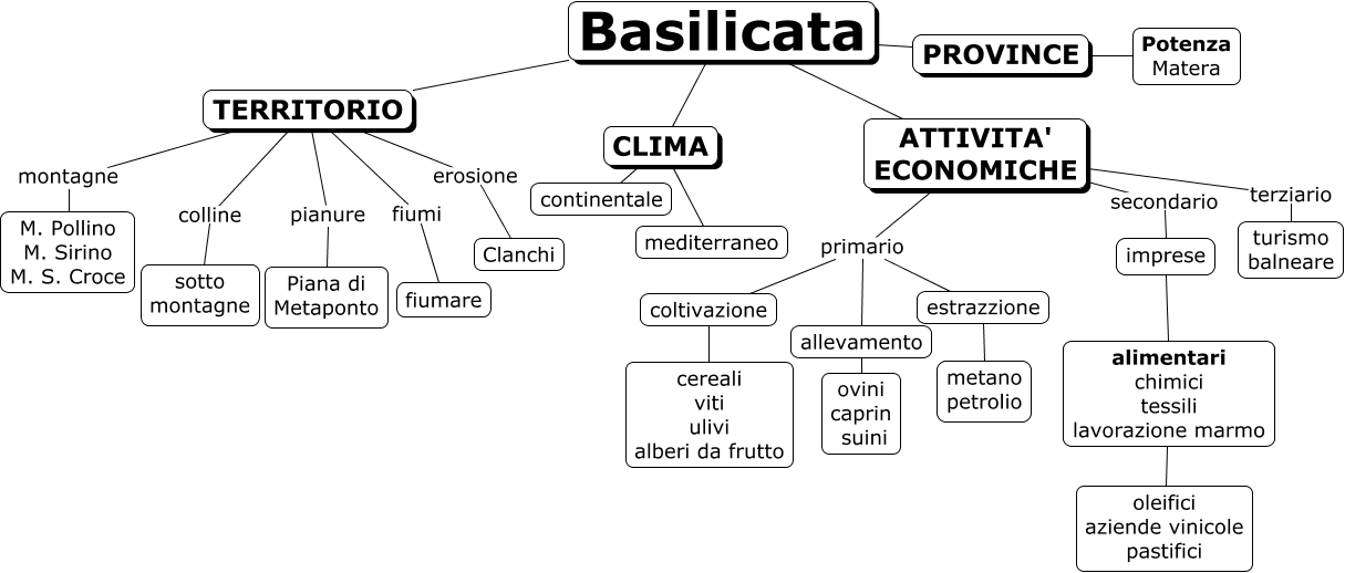 Questa Cmap, creata con IHMC CmapTools, contiene informazioni relative a: Basilicta, imprese alimentari chimici tessili lavorazione marmo, coltivazione cereali viti ulivi alberi da frutto, TERRITORIO erosione Clanchi, TERRITORIO colline sotto montagne, allevamento ovini caprin suini, Basilicata PROVINCE, Basilicata TERRITORIO, ATTIVITA' ECONOMICHE terziario turismo balneare, ATTIVITA' ECONOMICHE primario allevamento, estrazzione metano petrolio, ATTIVITA' ECONOMICHE primario estrazzione, alimentari chimici tessili lavorazione marmo oleifici aziende vinicole pastifici, TERRITORIO montagne M. Pollino M. Sirino M. S. Croce, Basilicata ATTIVITA' ECONOMICHE, Basilicata CLIMA, TERRITORIO pianure Piana di Metaponto, TERRITORIO fiumi fiumare, CLIMA continentale, PROVINCE Potenza Matera, ATTIVITA' ECONOMICHE secondario imprese