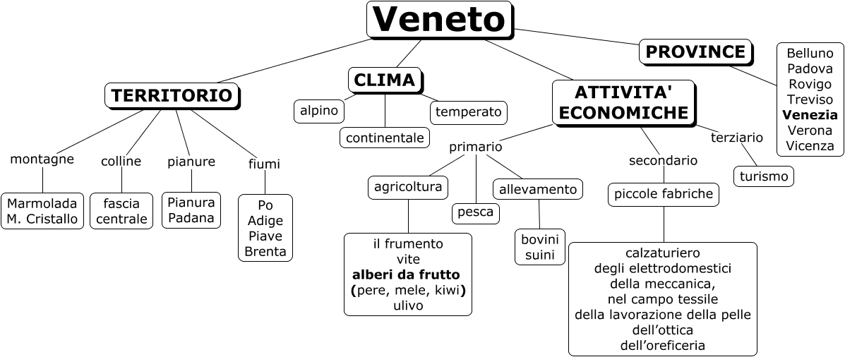 Questa Cmap, creata con IHMC CmapTools, contiene informazioni relative a: Veneto, ATTIVITA' ECONOMICHE primario allevamento, ATTIVITA' ECONOMICHE primario agricoltura, Veneto PROVINCE, Veneto CLIMA, TERRITORIO montagne Marmolada M. Cristallo, Veneto TERRITORIO, TERRITORIO pianure Pianura Padana, PROVINCE Belluno Padova Rovigo Treviso Venezia Verona Vicenza, CLIMA continentale, ATTIVITA' ECONOMICHE terziario turismo, allevamento bovini suini, piccole fabriche calzaturiero degli elettrodomestici della meccanica, nel campo tessile della lavorazione della pelle dell’ottica dell’oreficeria, agricoltura il frumento vite alberi da frutto (pere, mele, kiwi) ulivo, Veneto ATTIVITA' ECONOMICHE, TERRITORIO colline fascia centrale, CLIMA alpino, ATTIVITA' ECONOMICHE primario pesca, ATTIVITA' ECONOMICHE secondario piccole fabriche, CLIMA temperato, TERRITORIO fiumi Po Adige Piave Brenta