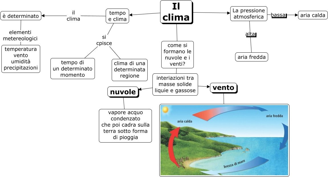 Questa Cmap, creata con IHMC CmapTools, contiene informazioni relative a: Il clima, interiazioni tra masse solide liquie e gassose vento, vento, è determinato elementi metereologici temperatura vento umidità precipitazioni, come si formano le nuvole e i venti? interiazioni tra masse solide liquie e gassose, nuvole vapore acquo condenzato che poi cadra sulla terra sotto forma di pioggia, Il clima tempo e clima, interiazioni tra masse solide liquie e gassose nuvole, Il clima La pressione atmosferica, tempo e clima il clima è determinato, La pressione atmosferica alta aria fredda, La pressione atmosferica bassa aria calda, tempo e clima si cpisce tempo di un determinato momento, tempo e clima si cpisce clima di una determinata regione, Il clima come si formano le nuvole e i venti?
