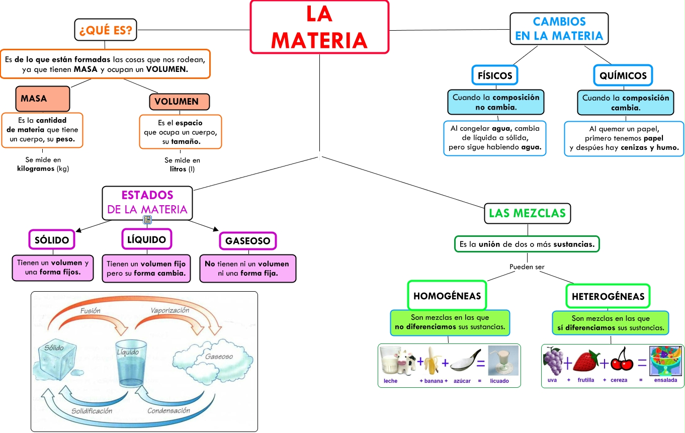 Este Cmap, tiene información relacionada con: LA MATERIA, L�?QUIDO ???? Tienen un volumen fijo pero su forma cambia., ¿QUÉ ES? ???? Es de lo que están formadas las cosas que nos rodean, ya que tienen MASA y ocupan un VOLUMEN., Es la cantidad de materia que tiene un cuerpo, su peso. ???? Se mide en kilogramos (kg), Son mezclas en las que sí diferenciamos sus sustancias. ????, F�?SICOS ???? Cuando la composición no cambia., HETEROGÉNEAS ???? Son mezclas en las que sí diferenciamos sus sustancias., HOMOGÉNEAS ?? Son mezclas en las que no diferenciamos sus sustancias., ESTADOS DE LA MATERIA ???? GASEOSO, Cuando la composición no cambia. ???? Al congelar agua, cambia de líquida a sólida, pero sigue habiendo agua., Es el espacio que ocupa un cuerpo, su tamaño. ???? Se mide en litros (l), Es la unión de dos o más sustancias. Pueden ser HOMOGÉNEAS, ESTADOS DE LA MATERIA ???? L�?QUIDO, LA MATERIA ESTADOS DE LA MATERIA, Es de lo que están formadas las cosas que nos rodean, ya que tienen MASA y ocupan un VOLUMEN. ???? MASA, ???? LAS MEZCLAS, LA MATERIA ???? CAMBIOS EN LA MATERIA, ESTADOS DE LA MATERIA ???? SÓLIDO, CAMBIOS EN LA MATERIA ???? F�?SICOS, CAMBIOS EN LA MATERIA ???? QU�?MICOS, Es la unión de dos o más sustancias. Pueden ser HETEROGÉNEAS