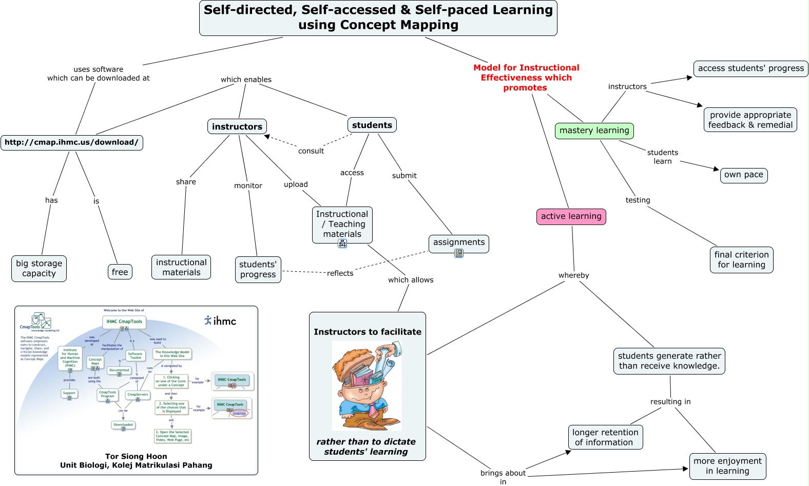 This Concept Map, created with IHMC CmapTools, has information related to: Presentation_CM, mastery learning instructors provide appropriate feedback & remedial, Self-directed, Self-accessed & Self-paced Learning using Concept Mapping Model for Instructional Effectiveness which promotes mastery learning, students consult instructors, http://cmap.ihmc.us/download/ has big storage capacity, students generate rather than receive knowledge. resulting in longer retention of information, students access Instructional / Teaching materials, instructors upload Instructional / Teaching materials, mastery learning students learn own pace, active learning whereby students generate rather than receive knowledge., mastery learning testing final criterion for learning, Instructors to facilitate rather than to dictate students' learning brings about in more enjoyment in learning, instructors share instructional materials, http://cmap.ihmc.us/download/ which enables students, Instructional / Teaching materials which allows Instructors to facilitate rather than to dictate students' learning, Self-directed, Self-accessed & Self-paced Learning using Concept Mapping Model for Instructional Effectiveness which promotes active learning, active learning whereby Instructors to facilitate rather than to dictate students' learning, http://cmap.ihmc.us/download/ which enables instructors, mastery learning instructors access students' progress, Self-directed, Self-accessed & Self-paced Learning using Concept Mapping uses software which can be downloaded at http://cmap.ihmc.us/download/, students submit assignments