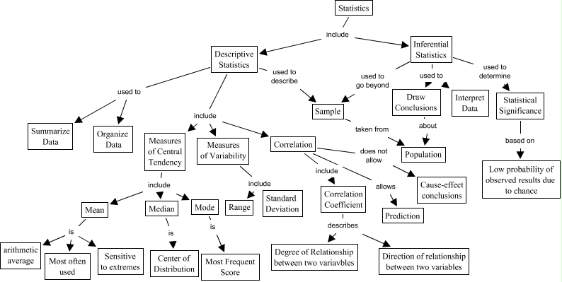 This Concept Map, created with IHMC CmapTools, has information related to: Statistics, Draw Conclusions about Population, Inferential Statistics used to Interpret Data, Mean is Sensitive to extremes, Statistical Significance based on Low probability of observed results due to chance, Measures of Central Tendency include Mode, Median is Center of Distribution, Statistics include Descriptive Statistics, Mean is arithmetic average, Mode is Most Frequent Score, Measures of Variability include Range, Statistics include Inferential Statistics, Inferential Statistics used to Draw Conclusions, Descriptive Statistics used to Summarize Data, Correlation Coefficient describes Degree of Relationship between two variavbles, Measures of Central Tendency include Median, Correlation include Correlation Coefficient, Measures of Central Tendency include Mean, Descriptive Statistics used to Organize Data, Correlation allows Prediction, Descriptive Statistics used to describe Sample