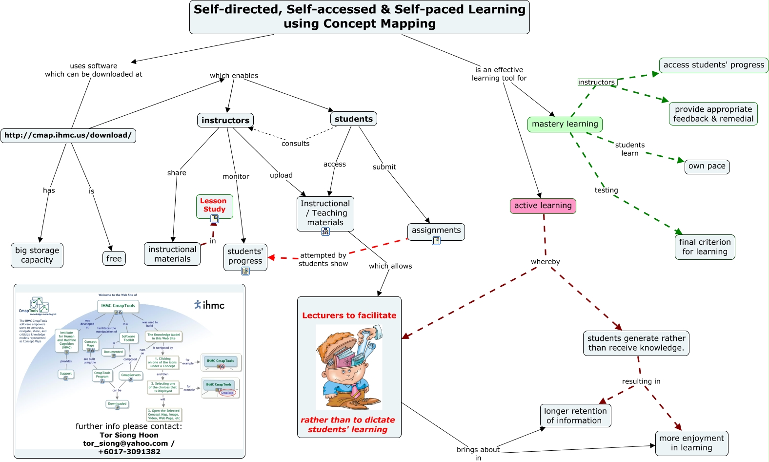 This Concept Map, created with IHMC CmapTools, has information related to: T&L using Concept Mapping, active learning whereby Lecturers to facilitate rather than to dictate students' learning, instructional materials in Lesson Study, students generate rather than receive knowledge. resulting in more enjoyment in learning, Self-directed, Self-accessed & Self-paced Learning using Concept Mapping uses software which can be downloaded at http://cmap.ihmc.us/download/, Lecturers to facilitate rather than to dictate students' learning brings about in more enjoyment in learning, students access Instructional / Teaching materials, http://cmap.ihmc.us/download/ has big storage capacity, active learning whereby students generate rather than receive knowledge., students consults instructors, Self-directed, Self-accessed & Self-paced Learning using Concept Mapping is an effective learning tool for active learning, students generate rather than receive knowledge. resulting in longer retention of information, http://cmap.ihmc.us/download/ which enables students, Lecturers to facilitate rather than to dictate students' learning brings about in longer retention of information, http://cmap.ihmc.us/download/ is free, mastery learning students learn own pace, mastery learning instructors provide appropriate feedback & remedial, http://cmap.ihmc.us/download/ which enables instructors, Instructional / Teaching materials which allows Lecturers to facilitate rather than to dictate students' learning, Self-directed, Self-accessed & Self-paced Learning using Concept Mapping is an effective learning tool for mastery learning, instructors monitor students' progress