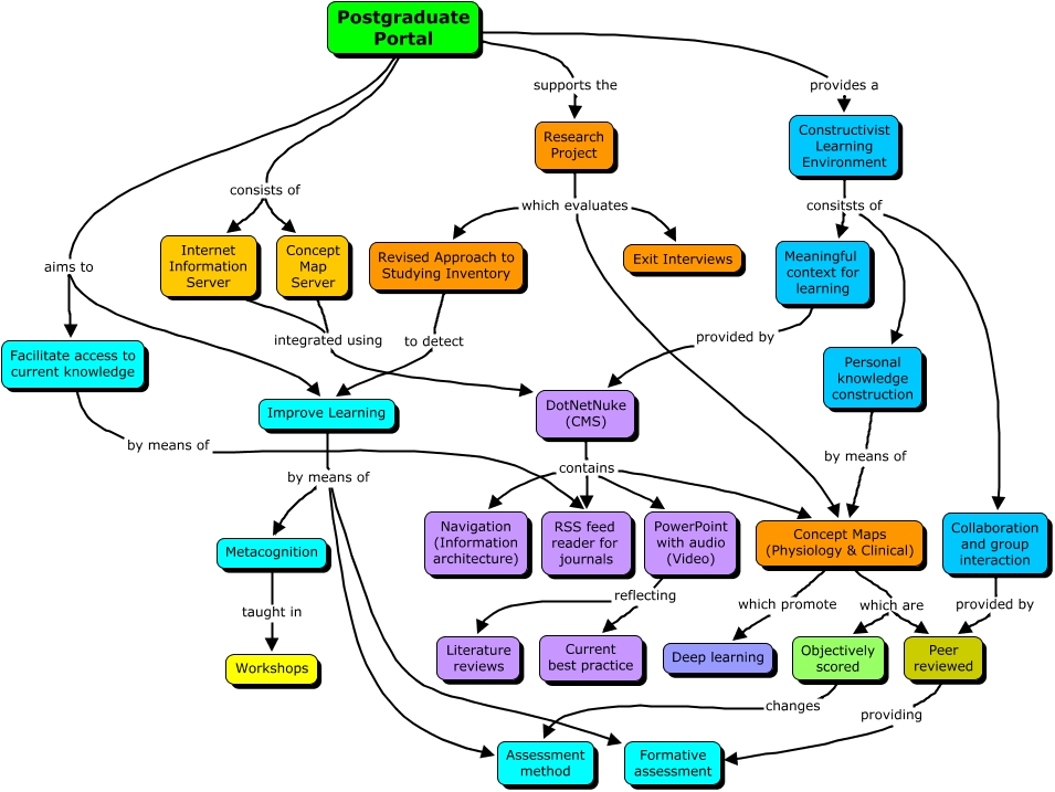This Concept Map, created with IHMC CmapTools, has information related to: Postgraduate Portal, DotNetNuke (CMS) contains PowerPoint with audio (Video), Personal knowledge construction by means of Concept Maps (Physiology & Clinical), Constructivist Learning Environment consitsts of Collaboration and group interaction, Research Project which evaluates Concept Maps (Physiology & Clinical), DotNetNuke (CMS) contains RSS feed reader for journals, Constructivist Learning Environment consitsts of Meaningful context for learning, Research Project which evaluates Revised Approach to Studying Inventory, Peer reviewed providing Formative assessment, Postgraduate Portal consists of Concept Map Server, DotNetNuke (CMS) contains Navigation (Information architecture), Collaboration and group interaction provided by Peer reviewed, PowerPoint with audio (Video) reflecting Literature reviews, Postgraduate Portal aims to Improve Learning, Postgraduate Portal aims to Facilitate access to current knowledge, Meaningful context for learning provided by DotNetNuke (CMS), Concept Maps (Physiology & Clinical) which are Peer reviewed, Facilitate access to current knowledge by means of RSS feed reader for journals, Revised Approach to Studying Inventory to detect Improve Learning, Concept Maps (Physiology & Clinical) which are Objectively scored, Postgraduate Portal provides a Constructivist Learning Environment