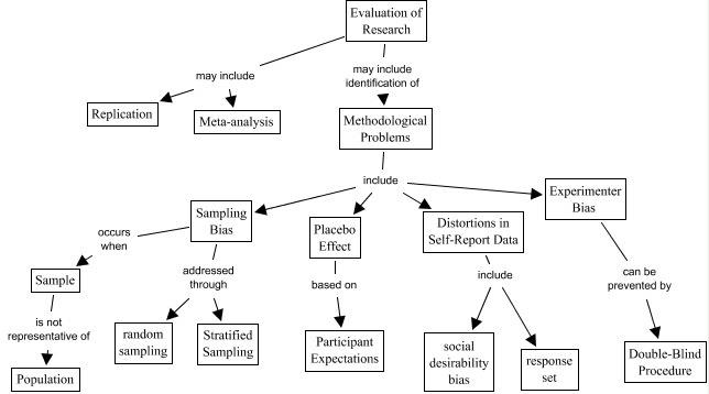 This Concept Map, created with IHMC CmapTools, has information related to: Evaluation of Research, Experimenter Bias can be prevented by Double-Blind Procedure, Methodological Problems include Sampling Bias, Methodological Problems include Placebo Effect, Methodological Problems include Distortions in Self-Report Data, Sampling Bias occurs when Sample, Sampling Bias addressed through random sampling, Distortions in Self-Report Data include response set, Evaluation of Research may include identification of Methodological Problems, Sampling Bias addressed through Stratified Sampling, Placebo Effect based on Participant Expectations, Methodological Problems include Experimenter Bias, Evaluation of Research may include Replication, Sample is not representative of Population, Distortions in Self-Report Data include social desirability bias, Evaluation of Research may include Meta-analysis