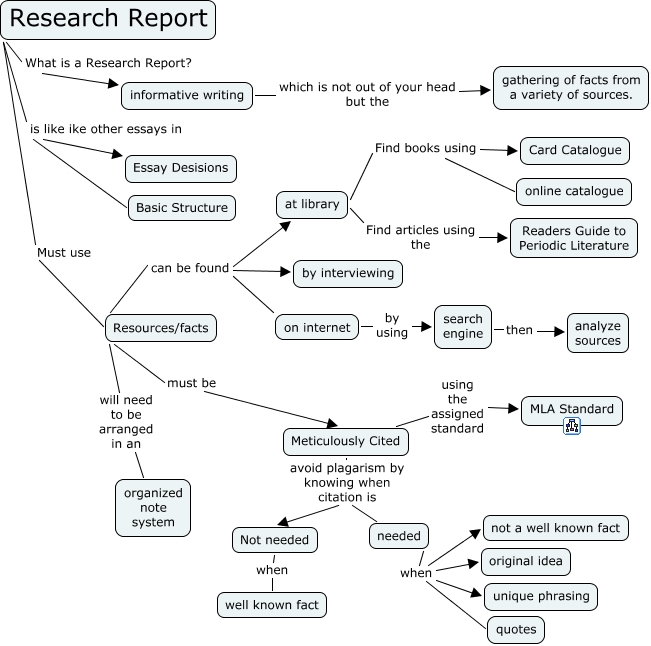 This Concept Map, created with IHMC CmapTools, has information related to: Research Report, Resources/facts will need to be arranged in an organized note system, Research Report is like ike other essays in Basic Structure, Research Report What is a Research Report? informative writing, at library Find books using Card Catalogue, search engine then analyze sources, Meticulously Cited using the assigned standard MLA Standard, needed when quotes, Resources/facts can be found on internet, at library Find books using online catalogue, Resources/facts can be found at library, Research Report is like ike other essays in Essay Desisions, informative writing which is not out of your head but the gathering of facts from a variety of sources., Meticulously Cited avoid plagarism by knowing when citation is Not needed, Research Report Must use Resources/facts, Meticulously Cited avoid plagarism by knowing when citation is needed, needed when original idea, Resources/facts can be found by interviewing, needed when unique phrasing, Resources/facts must be Meticulously Cited, Not needed when well known fact