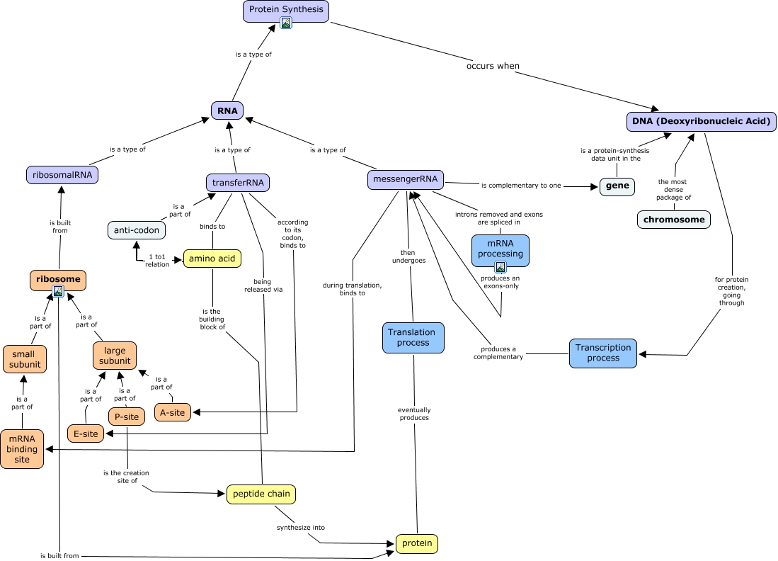 This Concept Map, created with IHMC CmapTools, has information related to: Protein synthesis, anti-codon is a part of transferRNA, mRNA processing produces an exons-only messengerRNA, P-site is a part of large subunit, ribosomalRNA is a type of RNA, ribosome is built from protein, gene is a protein-synthesis data unit in the DNA (Deoxyribonucleic Acid), messengerRNA introns removed and exons are spliced in mRNA processing, amino acid is the building block of peptide chain, Transcription process produces a complementary messengerRNA, Translation process eventually produces protein, large subunit is a part of ribosome, messengerRNA during translation, binds to mRNA binding site, mRNA binding site is a part of small subunit, P-site is the creation site of peptide chain, messengerRNA is a type of RNA, A-site is a part of large subunit, small subunit is a part of ribosome, Protein Synthesis occurs when DNA (Deoxyribonucleic Acid), amino acid anti-codon, ribosome is built from ribosomalRNA