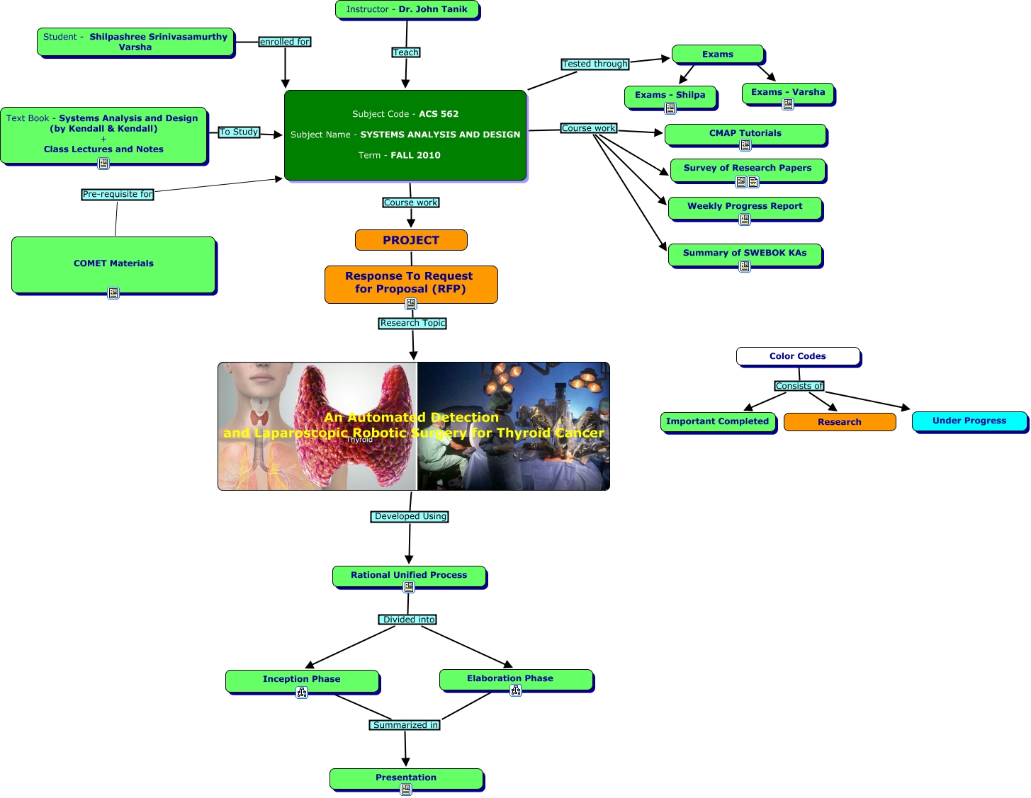 This Concept Map, created with IHMC CmapTools, has information related to: Example of Report, Color Codes Consists of Under Progress, Color Codes Consists of Research, Subject Code - ACS 562 Subject Name - SYSTEMS ANALYSIS AND DESIGN Term - FALL 2010 Course work Survey of Research Papers, Exams Exams - Varsha, Color Codes Consists of Important Completed, Subject Code - ACS 562 Subject Name - SYSTEMS ANALYSIS AND DESIGN Term - FALL 2010 Tested through Exams, Subject Code - ACS 562 Subject Name - SYSTEMS ANALYSIS AND DESIGN Term - FALL 2010 Course work PROJECT, Inception Phase Summarized in Presentation, Rational Unified Process Divided into Inception Phase, Text Book - Systems Analysis and Design (by Kendall & Kendall) + Class Lectures and Notes To Study Subject Code - ACS 562 Subject Name - SYSTEMS ANALYSIS AND DESIGN Term - FALL 2010, PROJECT Research Topic An Automated Detection and Laparoscopic Robotic Surgery for Thyroid Cancer, Elaboration Phase Summarized in Presentation, Subject Code - ACS 562 Subject Name - SYSTEMS ANALYSIS AND DESIGN Term - FALL 2010 Course work Summary of SWEBOK KAs, COMET Materials Pre-requisite for Subject Code - ACS 562 Subject Name - SYSTEMS ANALYSIS AND DESIGN Term - FALL 2010, Subject Code - ACS 562 Subject Name - SYSTEMS ANALYSIS AND DESIGN Term - FALL 2010 Course work CMAP Tutorials, Instructor - Dr. John Tanik Teach Subject Code - ACS 562 Subject Name - SYSTEMS ANALYSIS AND DESIGN Term - FALL 2010, Student - Shilpashree Srinivasamurthy Varsha enrolled for Subject Code - ACS 562 Subject Name - SYSTEMS ANALYSIS AND DESIGN Term - FALL 2010, Exams Exams - Shilpa, Rational Unified Process Divided into Elaboration Phase, An Automated Detection and Laparoscopic Robotic Surgery for Thyroid Cancer Developed Using Rational Unified Process