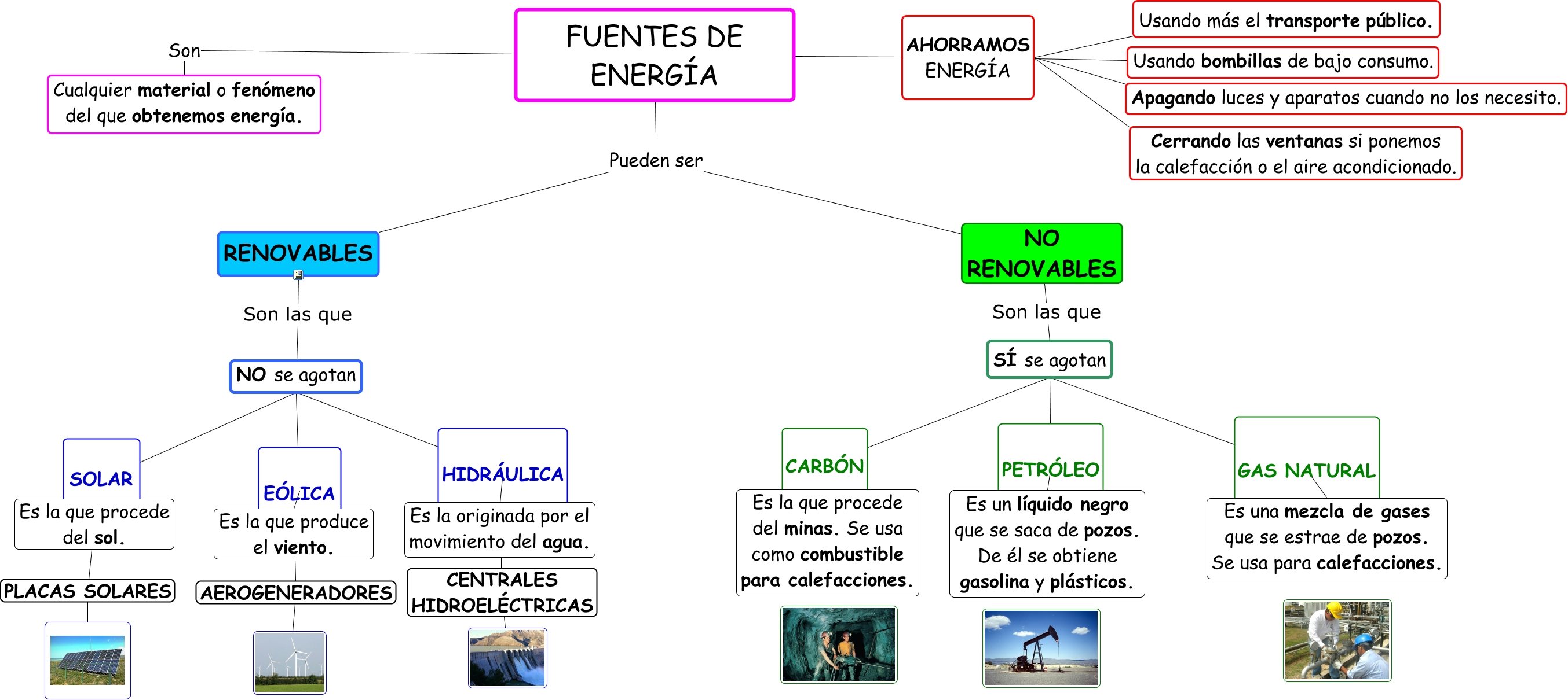 Este Cmap, tiene información relacionada con: FUENTES DE ENERGÍA, Cerrando las ventanas si ponemos la calefacción o el aire acondicionado. AHORRAMOS ENERGÍA Usando más el transporte público., Cerrando las ventanas si ponemos la calefacción o el aire acondicionado. AHORRAMOS ENERGÍA Usando bombillas de bajo consumo., FUENTES DE ENERGÍA AHORRAMOS ENERGÍA Usando más el transporte público., NO se agotan HIDRÁULICA Es la originada por el movimiento del agua., NO se agotan EÓLICA Es la que produce el viento., NO RENOVABLES Son las que SÍ se agotan, SÍ se agotan CARBÓN Es la que procede del minas. Se usa como combustible para calefacciones., Es la que procede del sol. PLACAS SOLARES, Es la que produce el viento. AEROGENERADORES, SÍ se agotan GAS NATURAL Es una mezcla de gases que se estrae de pozos. Se usa para calefacciones., FUENTES DE ENERGÍA Son Cualquier material o fenómeno del que obtenemos energía., Es la originada por el movimiento del agua. CENTRALES HIDROELÉCTRICAS, FUENTES DE ENERGÍA AHORRAMOS ENERGÍA Apagando luces y aparatos cuando no los necesito., FUENTES DE ENERGÍA Pueden ser RENOVABLES, SÍ se agotan PETRÓLEO Es un líquido negro que se saca de pozos. De él se obtiene gasolina y plásticos., Cerrando las ventanas si ponemos la calefacción o el aire acondicionado. AHORRAMOS ENERGÍA Apagando luces y aparatos cuando no los necesito., FUENTES DE ENERGÍA AHORRAMOS ENERGÍA Usando bombillas de bajo consumo., FUENTES DE ENERGÍA Pueden ser NO RENOVABLES, NO se agotan SOLAR Es la que procede del sol., RENOVABLES Son las que NO se agotan